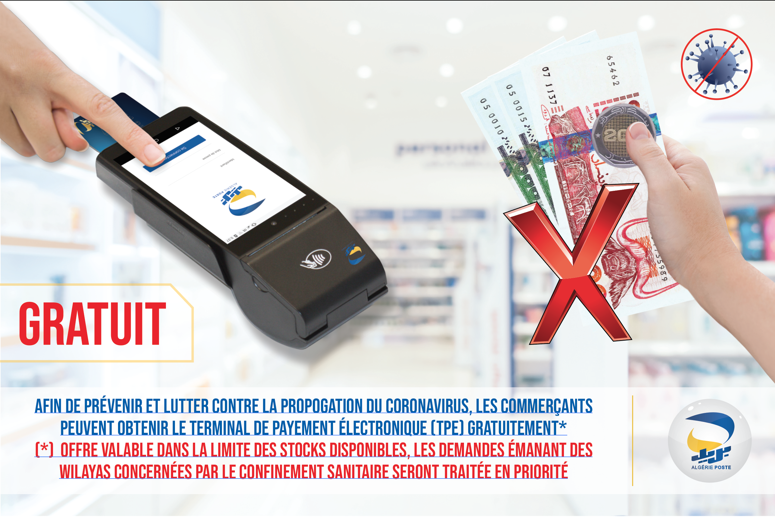 En raison de la période exceptionnelle que connait notre pays, caractérisée par la propagation du Corona Virus « COVID 19 », et dans le cadre de l’ensemble des mesures prises par Algérie Poste, notamment celles relatives à la généralisation et au déploiement des moyens de paiement électronique ; Il est porté à la connaissance des commerçants et opérateurs économiques autorisés à exercer leurs activités durant cette période, qu’il est désormais, possible d’acquérir les Terminaux de Paiement Electronique (TPE) auprès d’Algérie Poste, gratuitement.