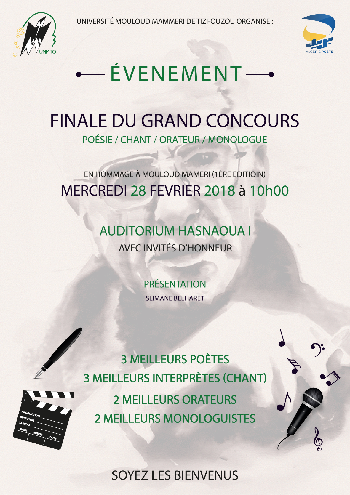 Algérie Poste est le partenaire officiel du grand concours culturel qui sera organisé par l’université de Tizi Ouzou Mouloud Mammeri à l’occasion du 29e anniversaire de la disparition de l’illustre écrivain et anthropologue Mouloud Mammeri, et dont la cérémonie de la phase finale est prévue pour le 28 Février 2018.