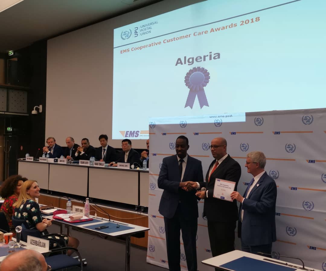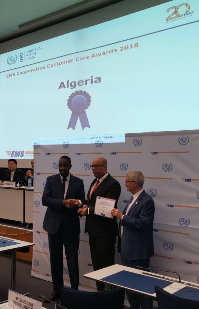 En effet, lors de la cérémonie des « Award UPU 2018» qui s’est tenue, ce 28 Mars 2019, au Siège de l’UPU, à Berne en Suisse, le PDG de l’opérateur Algérien Filiale Express Algérie Post (EMS) M. Nabil BENSISSAID a reçu le prix des meilleures performances dans la gestion de la relation à la clientèle par M. BISHAR Hussein, Directeur Général de l’UPU et M.Patrick RICHON, Président du Conseil de gestion de la Coopérative EMS et ce, en présence des représentants des 198 Pays membres de la coopérative EMS. Une attestation de reconnaissance a, également, été attribuée à tous les opérateurs lauréats.