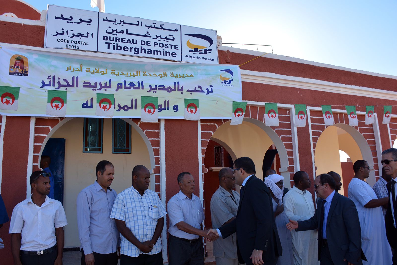 Accompagné de Monsieur le wali d’Adrar M. Bekkouche Hamou, de Monsieur le Président de l’Assemblée de wilaya, M. Bakri El-Bakri et des représentants des autorités locales, ainsi qu’une délégation ministérielle constituée de plusieurs cadres du secteur, le premier responsable d’Algérie Poste, a procédé à une visite de travail et d’inspection au niveau de plusieurs bureaux de poste de la région pour constater de visu la qualité des services qui y sont dispensés. Parmi les bureaux visités, on trouvera celui de la localité de Tiberghamine dans la commune d’Ougrout, ainsi que celui de Reggane avant de passer à l’ouverture officielle du bureau de poste d’Ouled Said qui a récemment bénéficié des travaux de réfection.