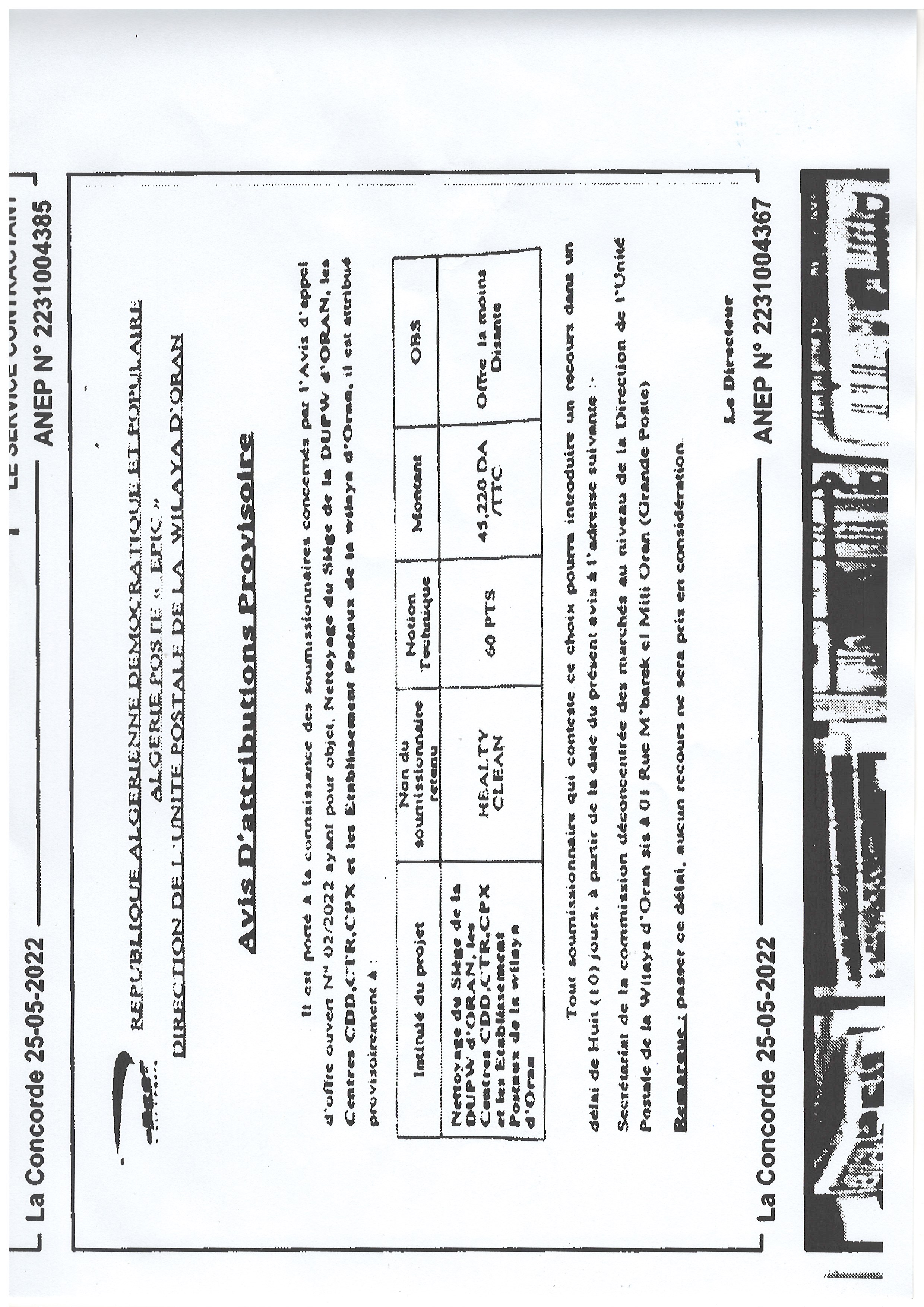 Objet : Nettoyage du siège de la DUPW d'ORAN,les centre CDD, CTR, CPX et les établissement postaux de la Wilaya d'ORAN