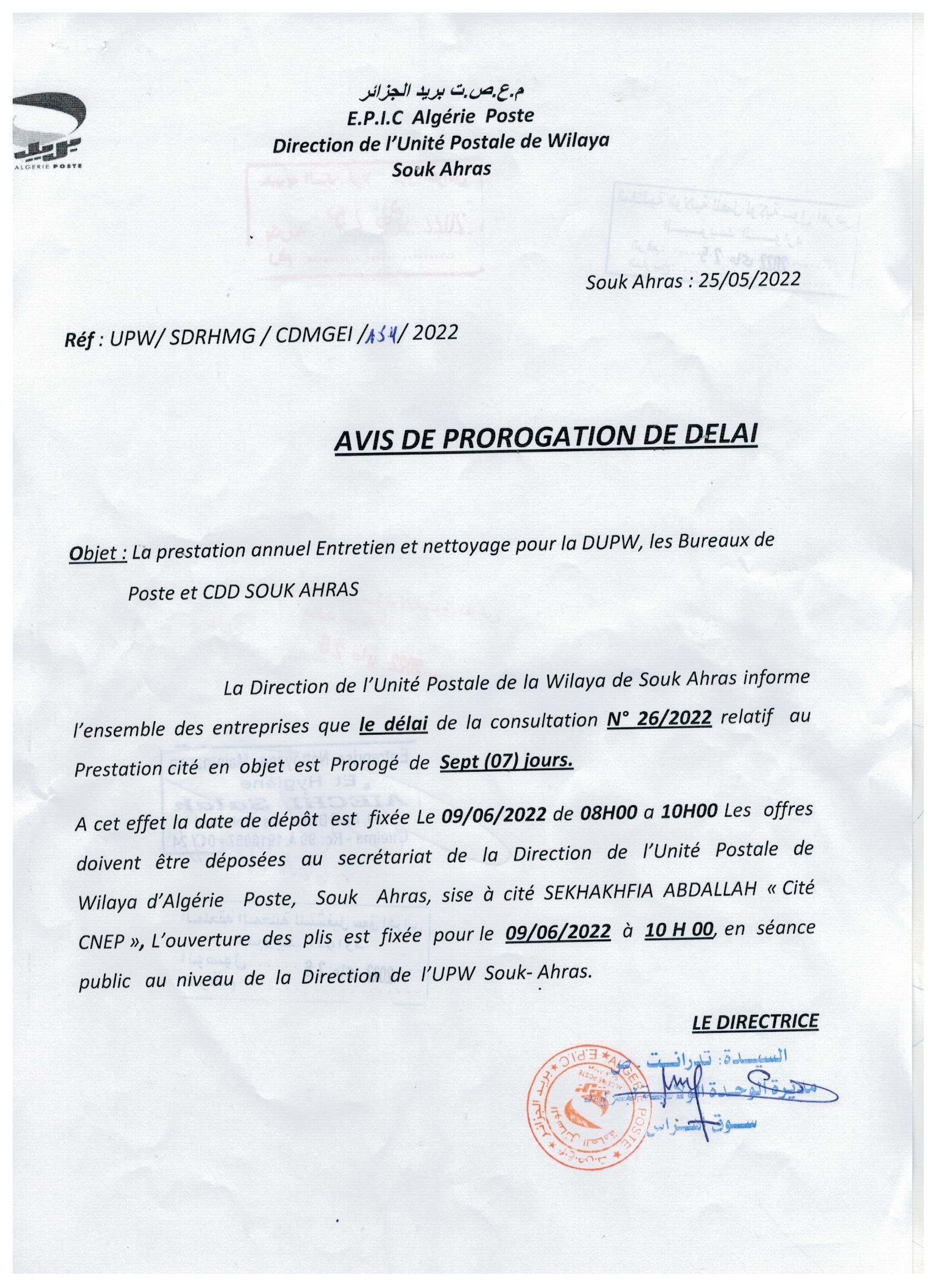 Objet : l'entretien et nettoyage du siège, centre et BP relevant de la direction de l'unité postale d'Alger centre est