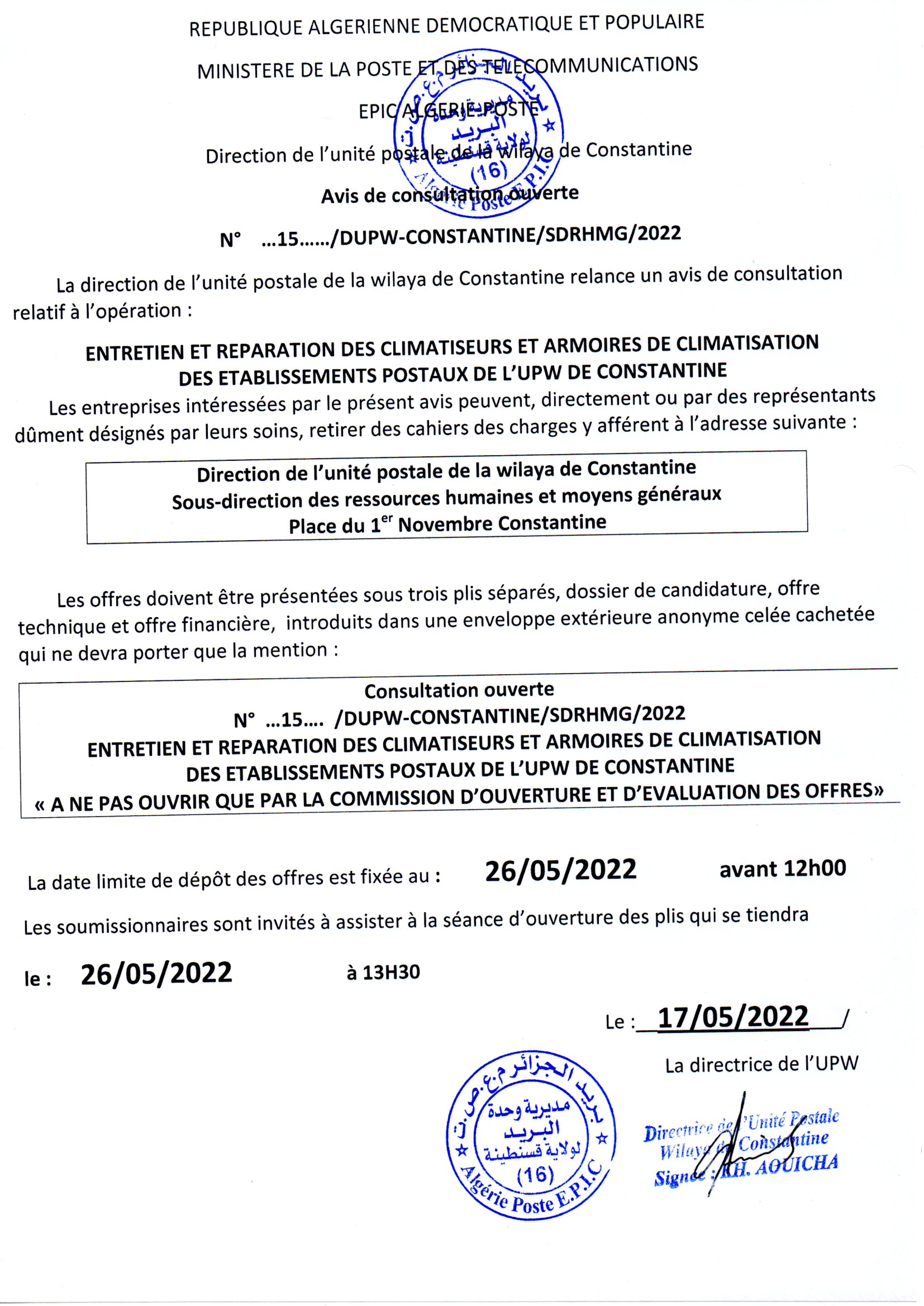 Objet : Entretien et réparation des climatiseurs et armoires de climatisations des etablissements postaux de la wilaya de CONSTANTINE