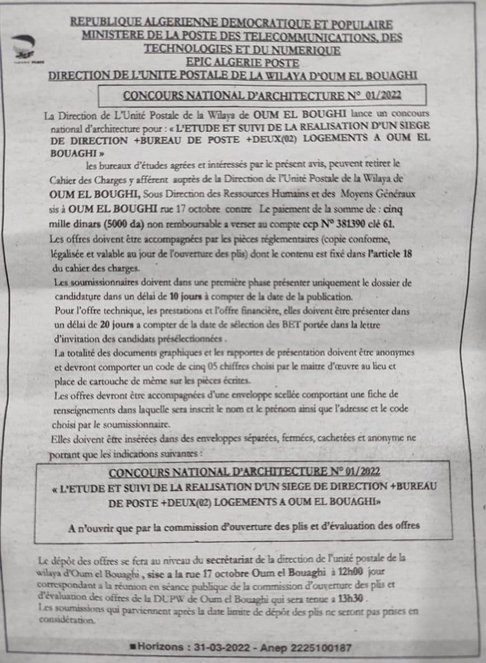 Objet : Etude et suivi de la réalisation d'un siege de direction + bp + 2 logements a OUM EL BOUAGHI
