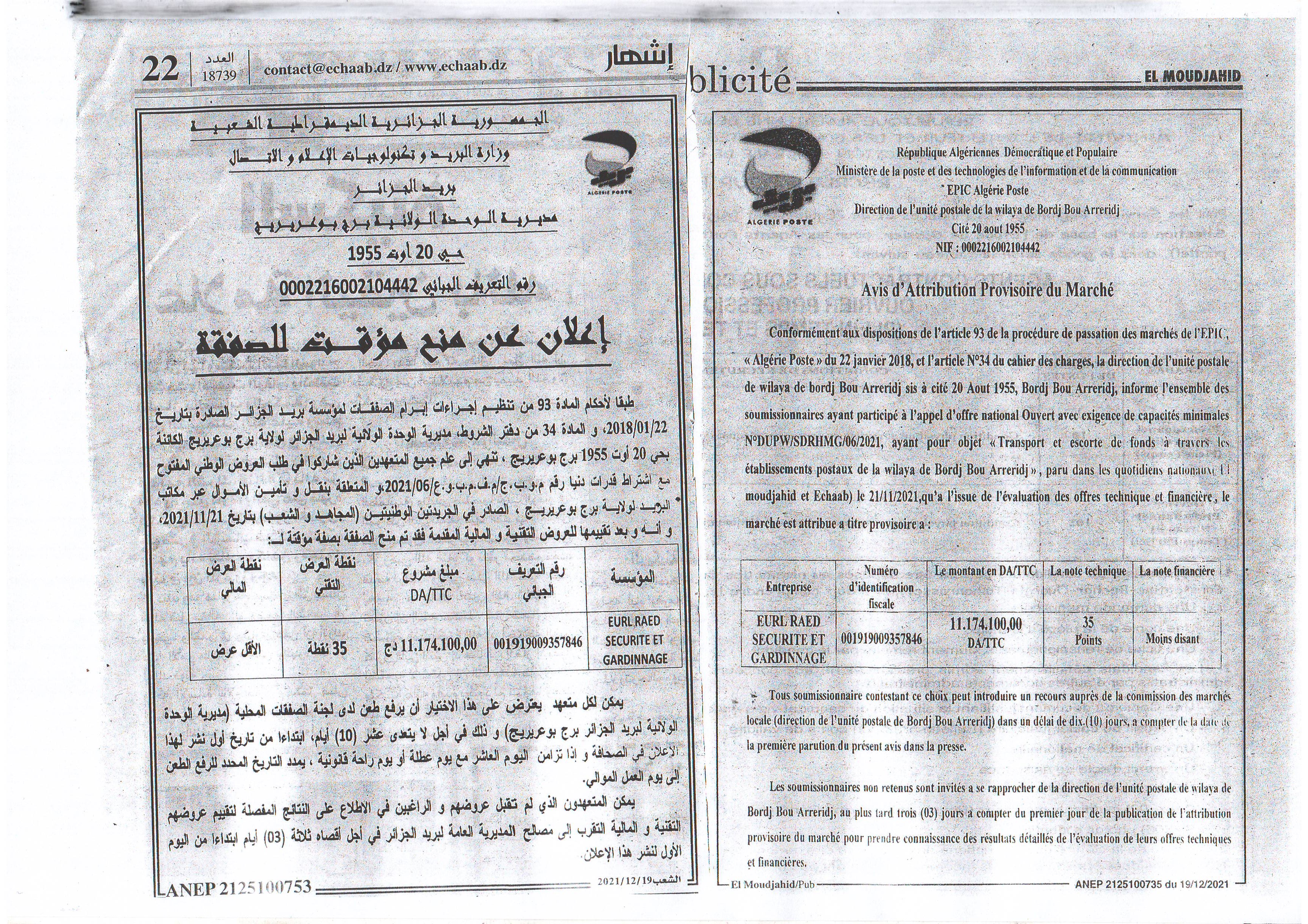 Objet : PRESTATIONS DE SÉCURITÉ DE CONVOYAGE ET ESCORTE DE FONDS POUR LES BUREAUX DE POSTE DE LA WILAYA DE SIDI BEL ABBES