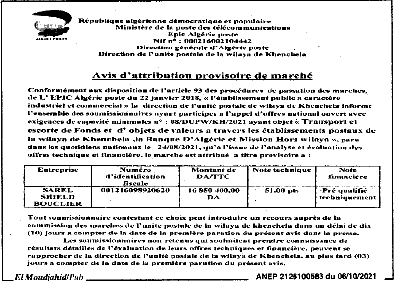 Objet : ENTRETIEN, LA REPARATION ET LA MAINTENANCE DES EQUIPEMENTS DU SYSTEME ANTI INTRUSION AU NIVEAU DES BUREAUX DE POSTE DE LA WILAYA DE KHENCHELA