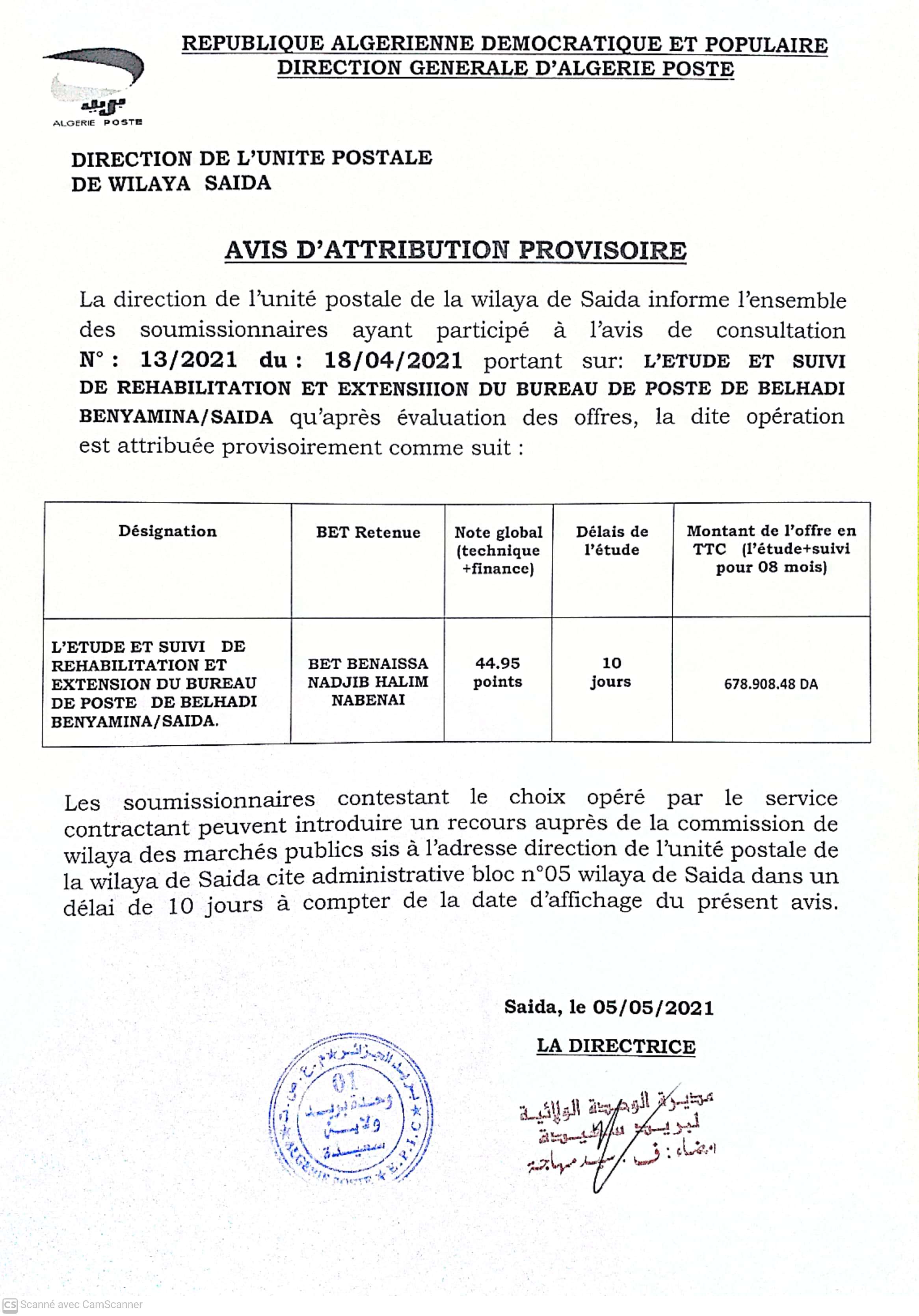 Objet : étude et suivi de réhabilitation et extension du bureau de poste de DELHADI BENYAMINA/ SAIDA