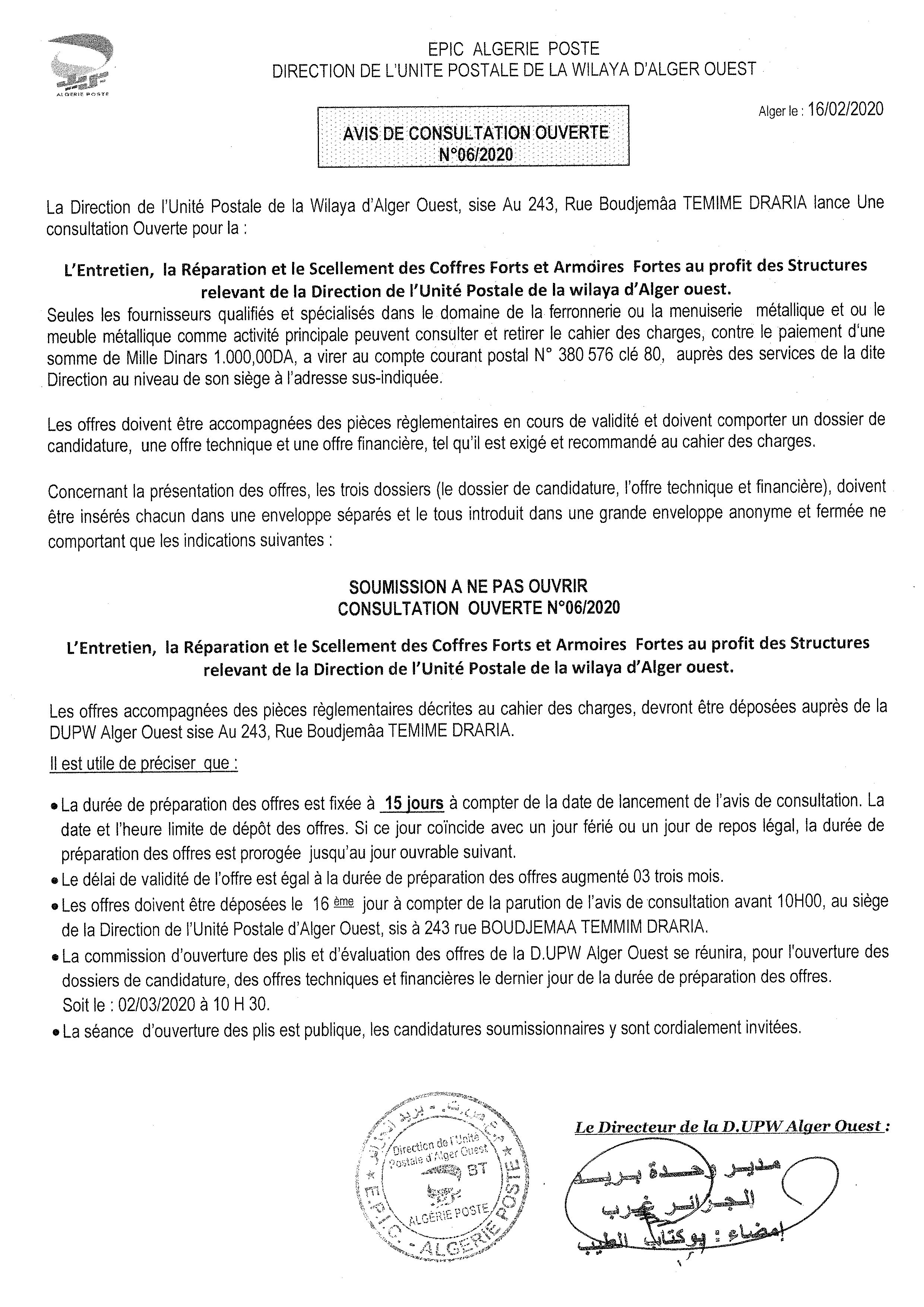 Objet : entretiens et réparation et le scellement des coffres forts et armoires fortes au profit des structures relevant de l'unité postale de la wilaya d'Alger Ouest