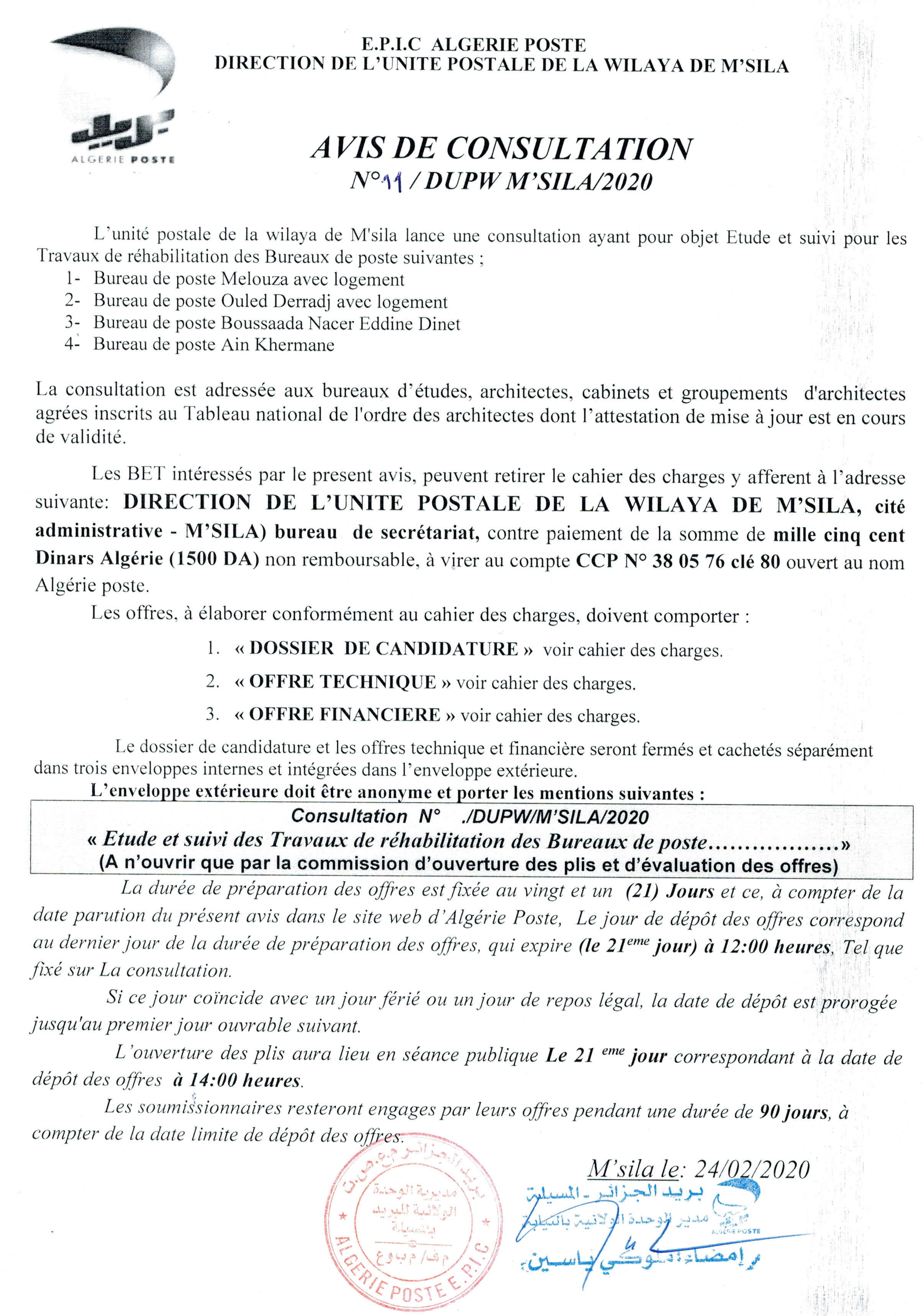 Objet : étude et suivi des travaux de réhabilitation des bureaux de poste