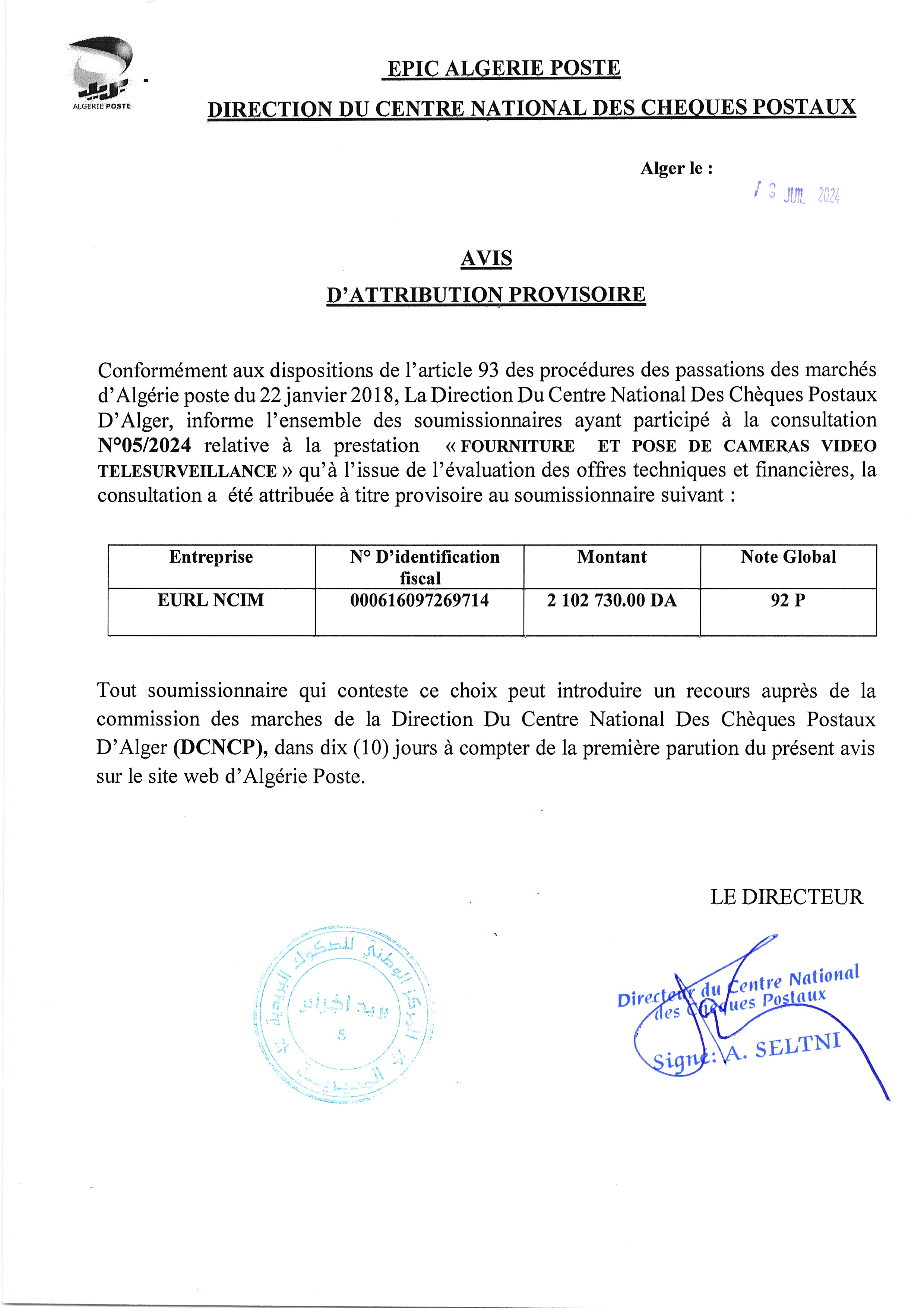 Objet : La fourniture, acquisition et mise en service d'un système de télésurveillance sur IP au niveau de (04) bureaux de poste de la wilaya d'Alger Centre