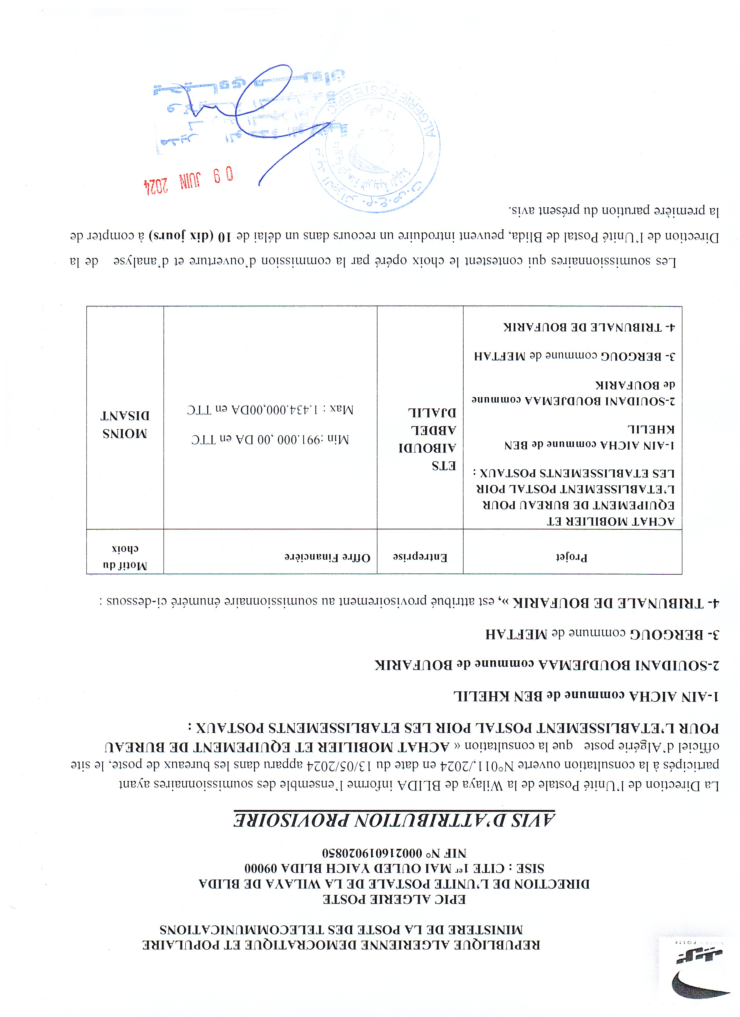 Objet : Achat mobilier et équipements de bureau duow BLIDA