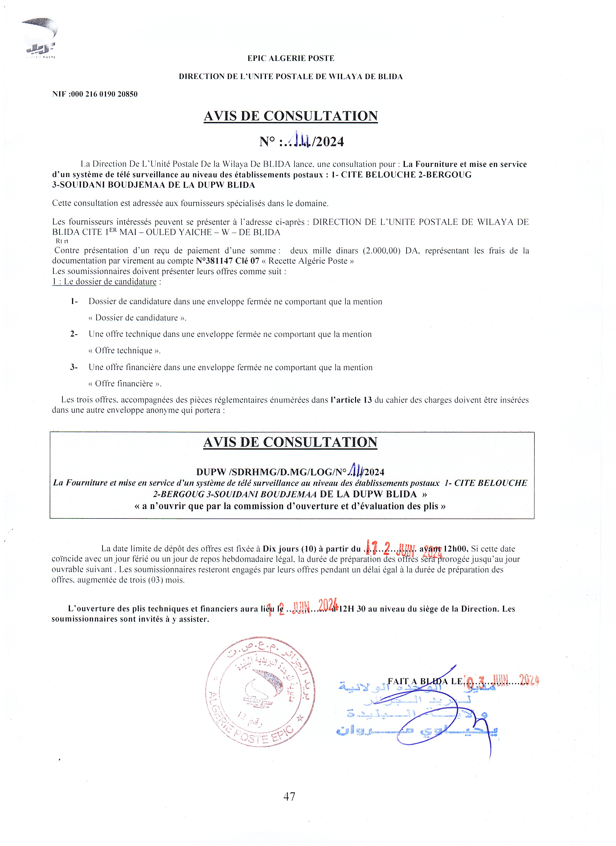 Objet : Fourniture et mise en service d'un système de télésurveillance DUPW BLIDA