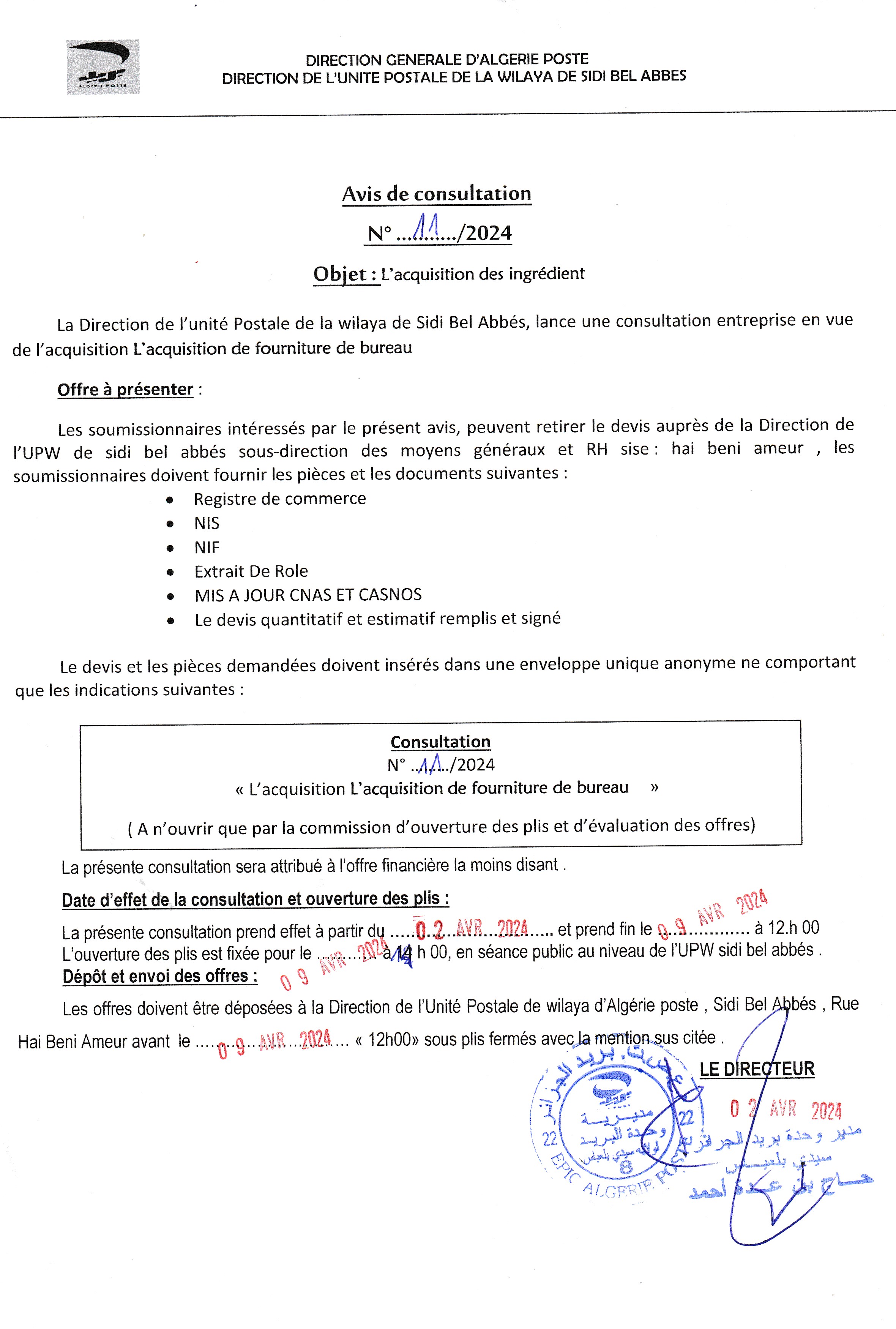 Objet : Acquisition de mobilier de bureau Au profit du nouveau bureau de poste Ayada,Daira de Ras El Oued , Wilaya de Bordj Bou Arreridj