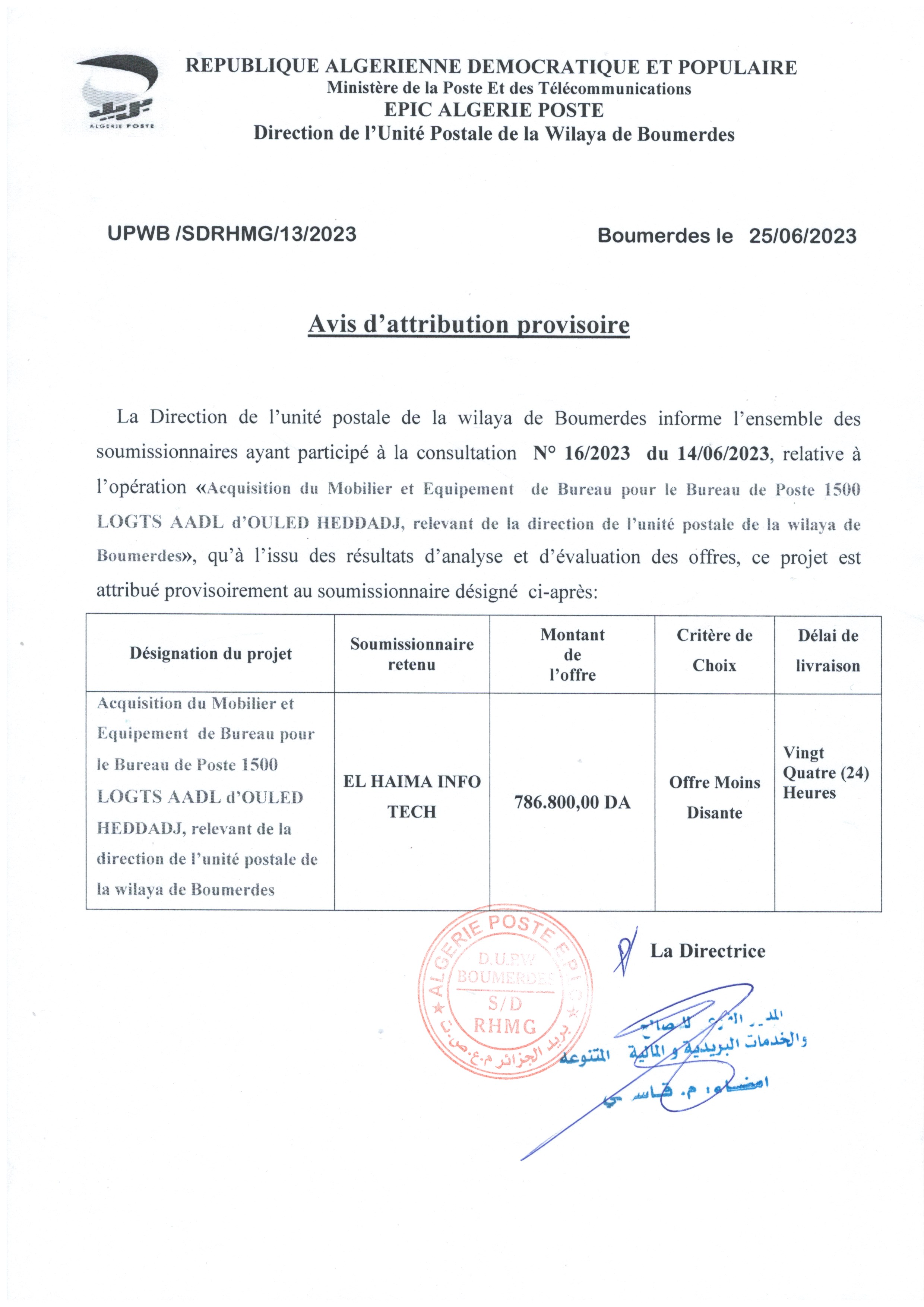 Objet : Acquisition du mobilier et equipements de bureau de poste 1500 logt aadl DUPW BOUMERDES