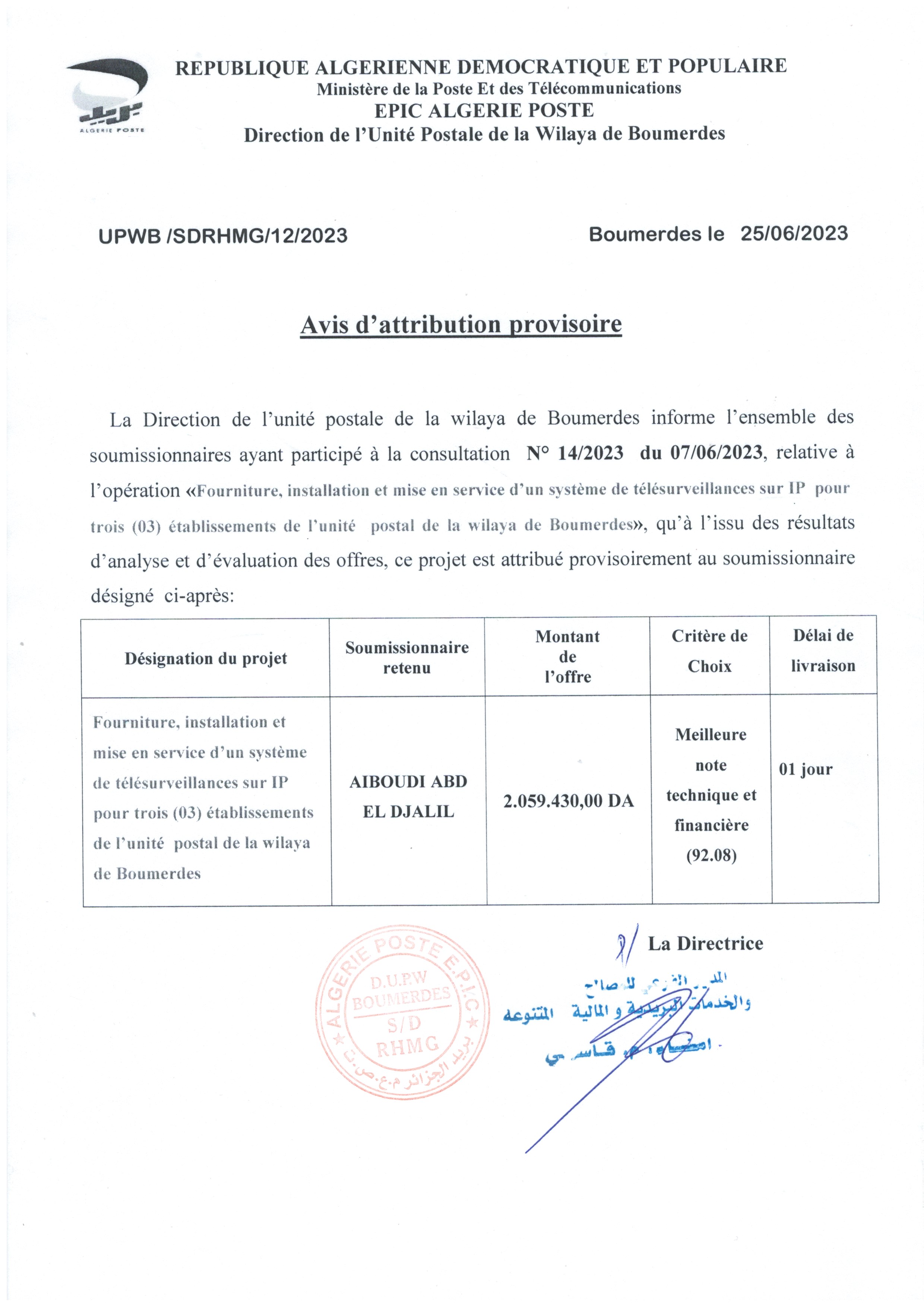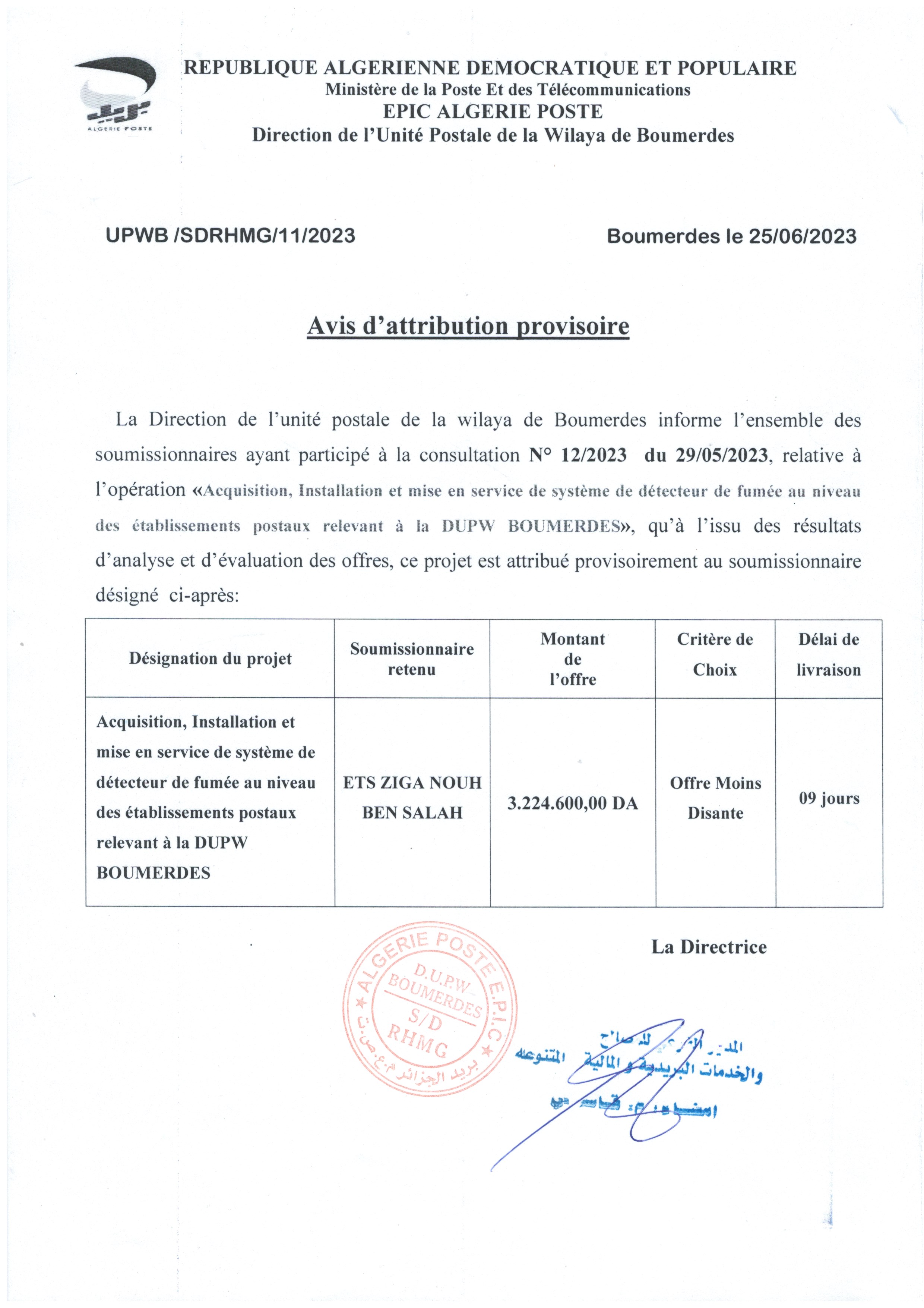 Objet : Acquisition installation et mise en service d'un systeme de detection de fumée pour les etab postaux de la wilaya de BOUMERDES