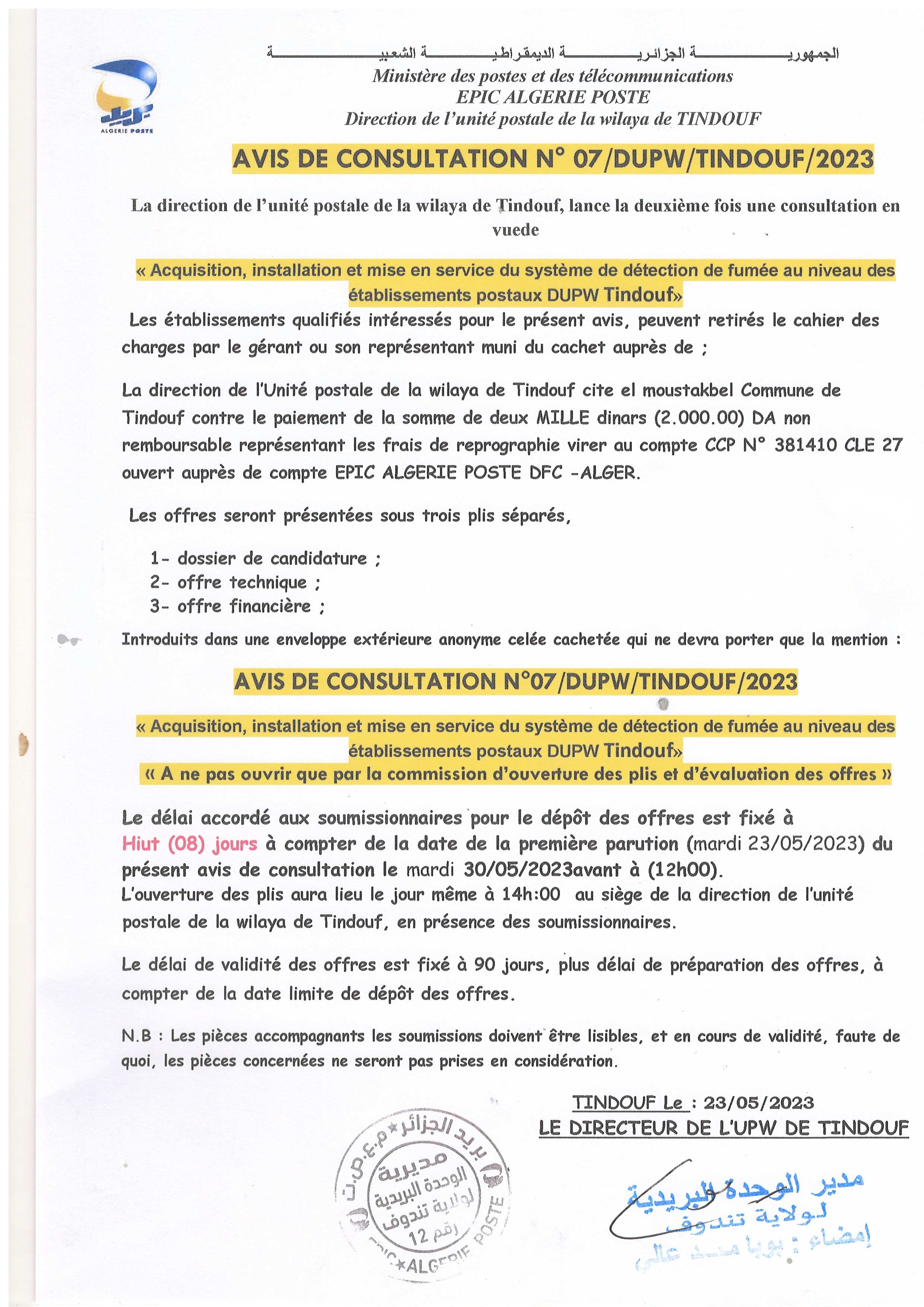 Objet : Acquisition installation et mise en service d'un systeme de detection de fumée au niveau des etab postaux DUPW TINDOUF