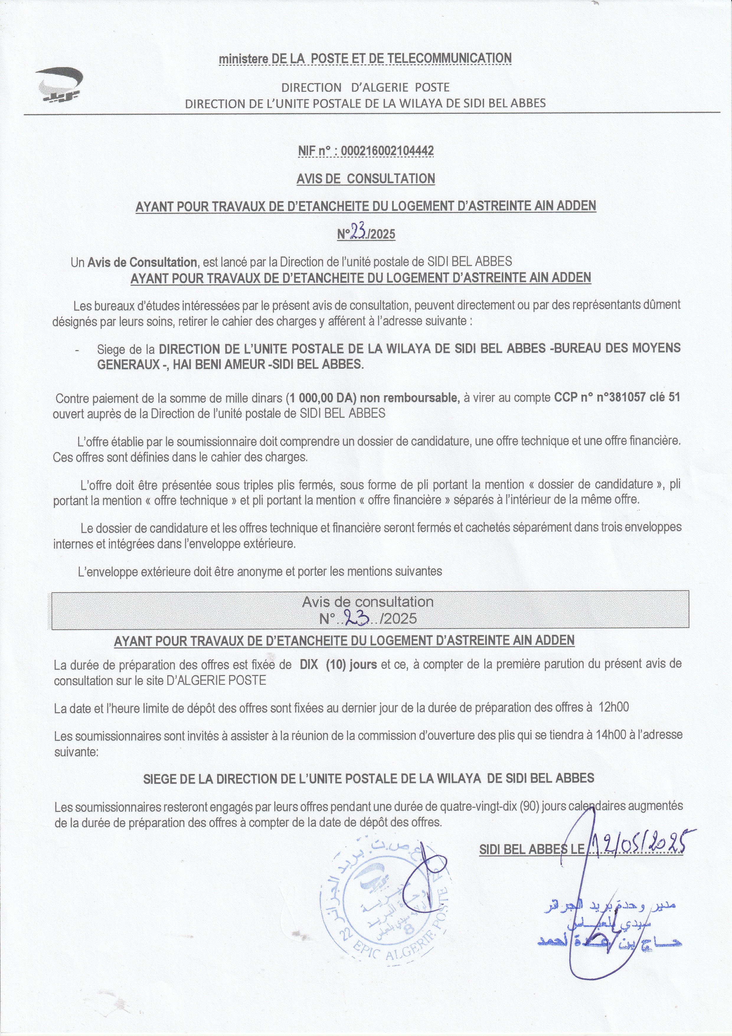 Objet : Acquisition des enseignes lumineuse pour les etablissements postaux de la DUPW BLIDA