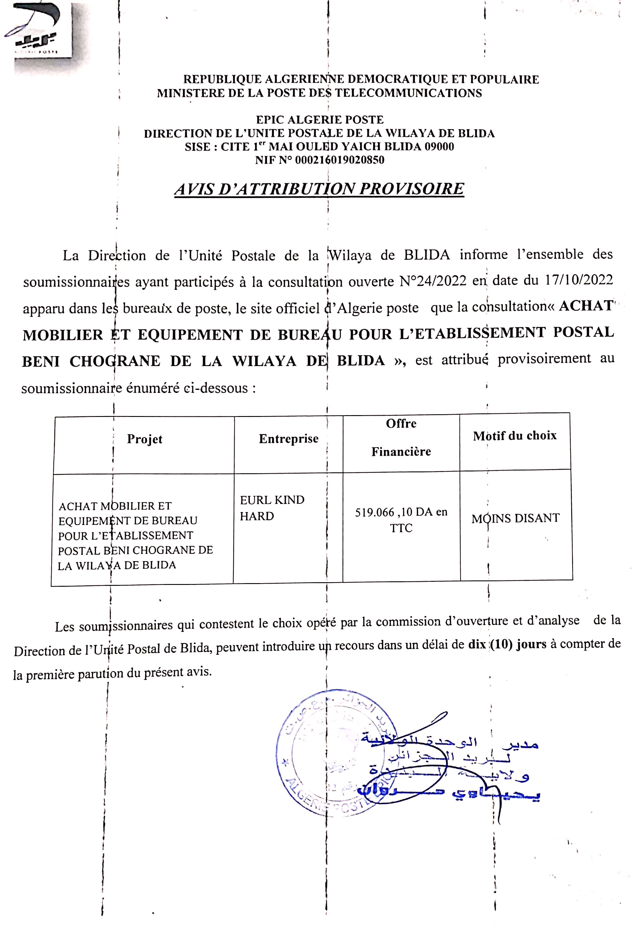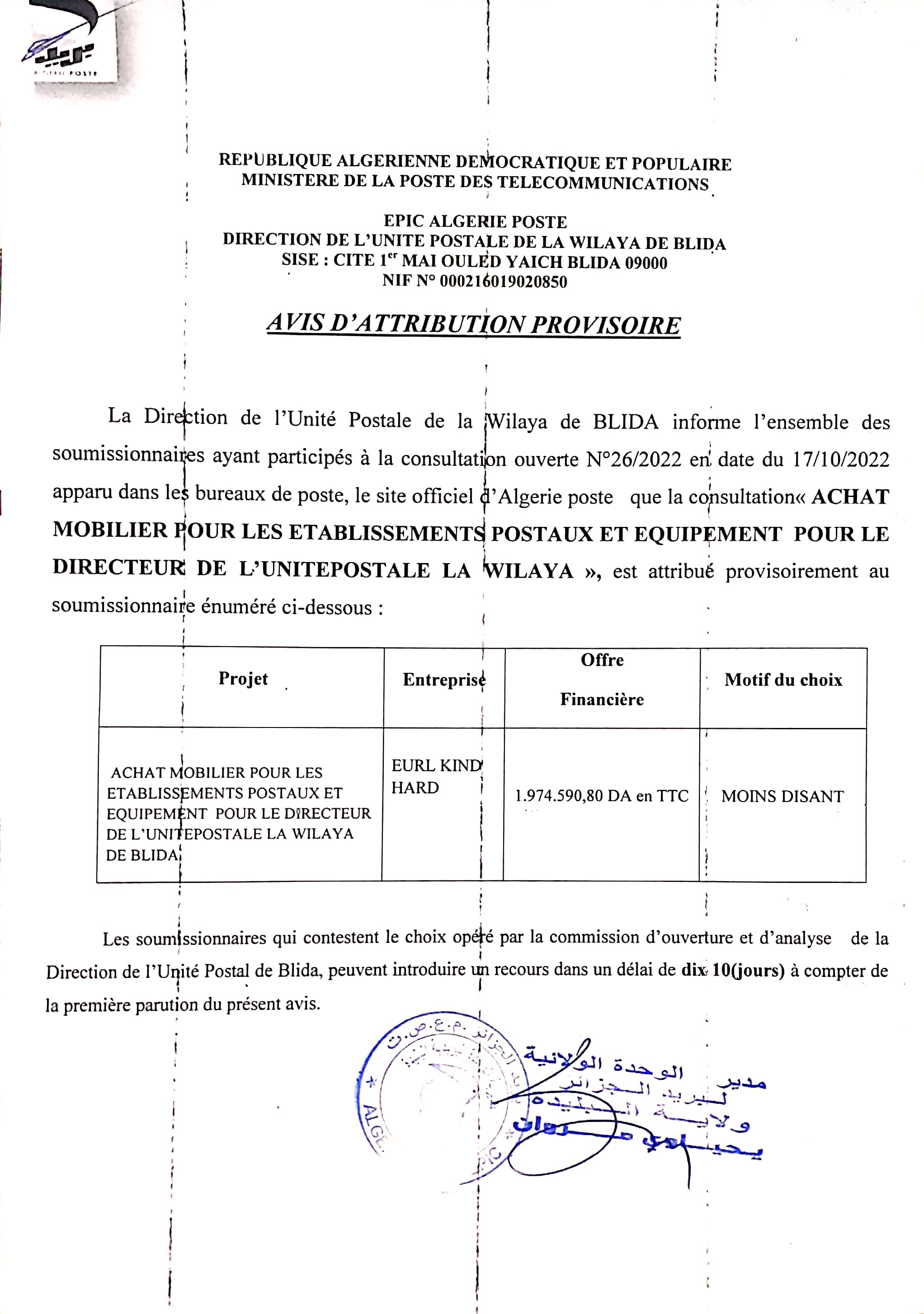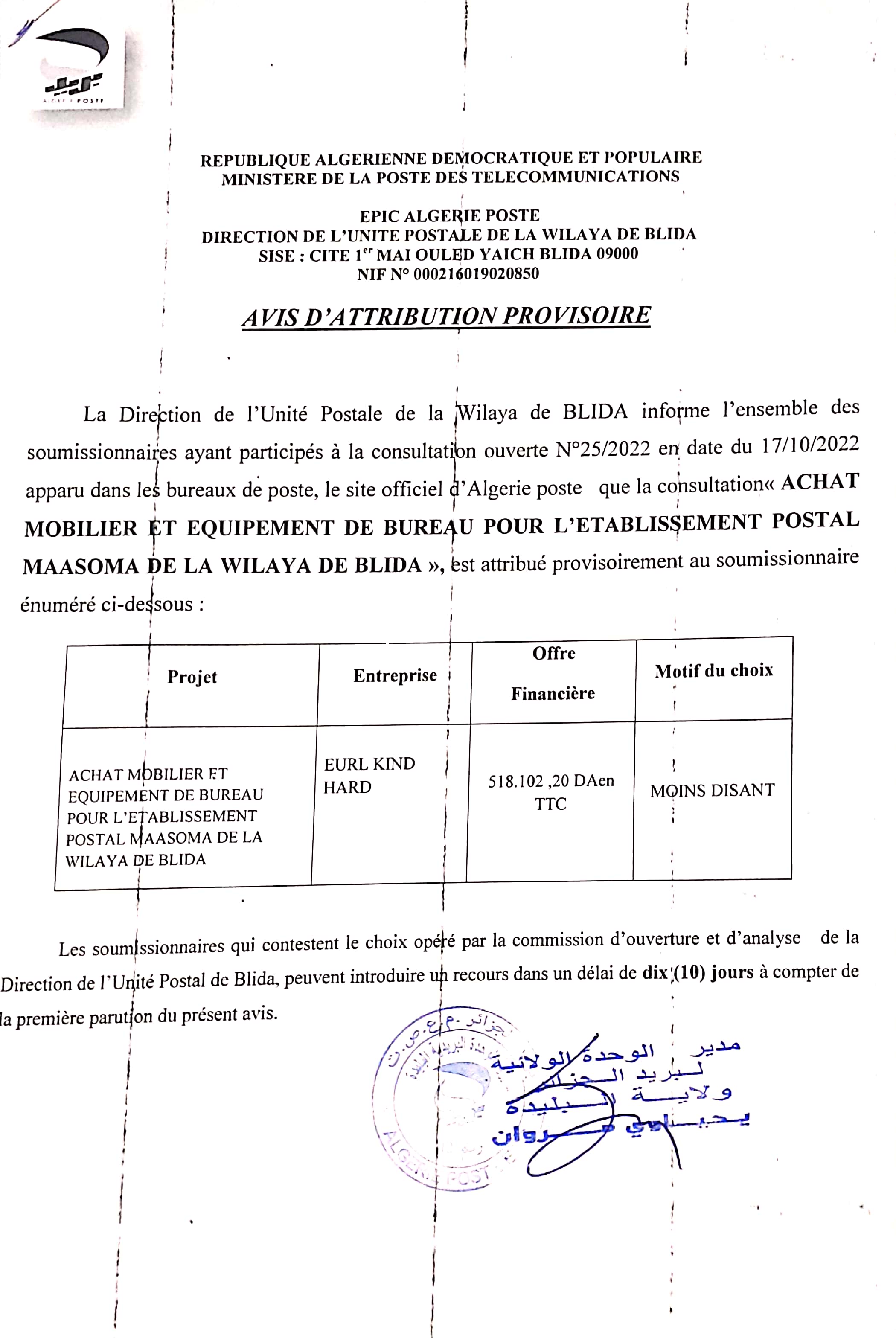 Objet : Fourniture et pose de mobilier de bureau au profit de la direction de l’unité postale de la Wilaya de Mostaganem