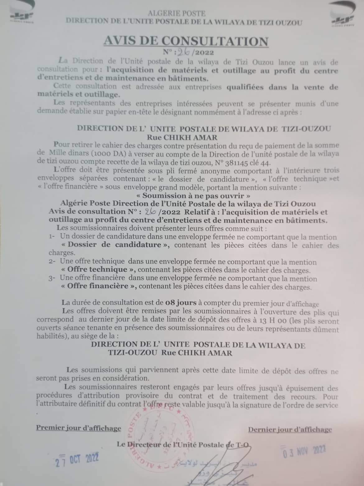 Objet : Fourniture, installation et mise en service d'un groupe electrogène au profit de l'Unité Postale de la Wilaya de Bordj Bou Arreridj