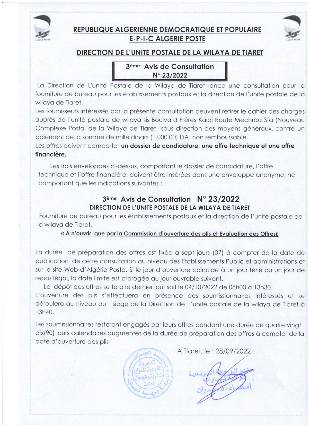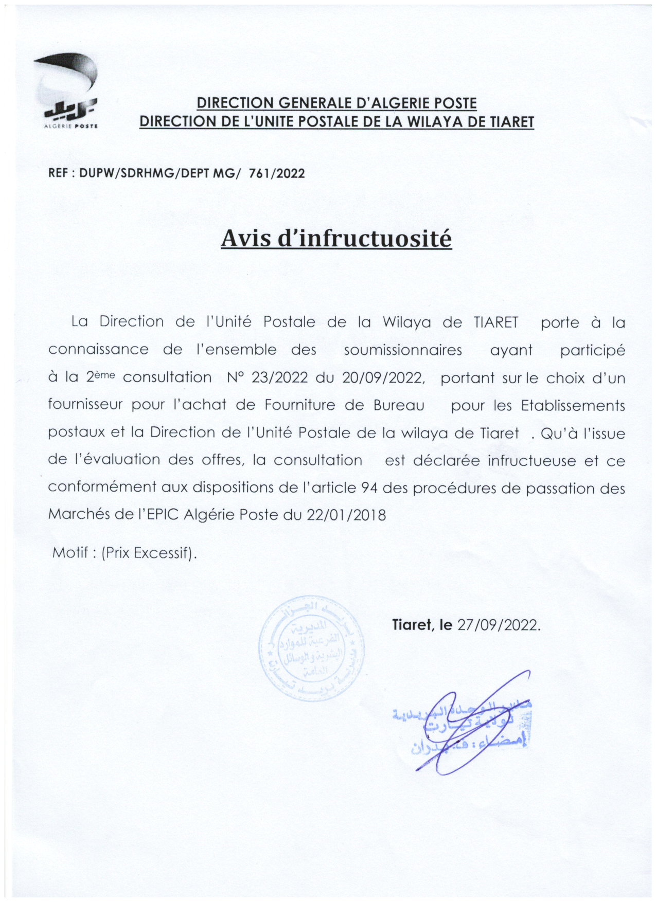 Objet : Fourniture de bureau pour les etablissements postaux upww TIARET