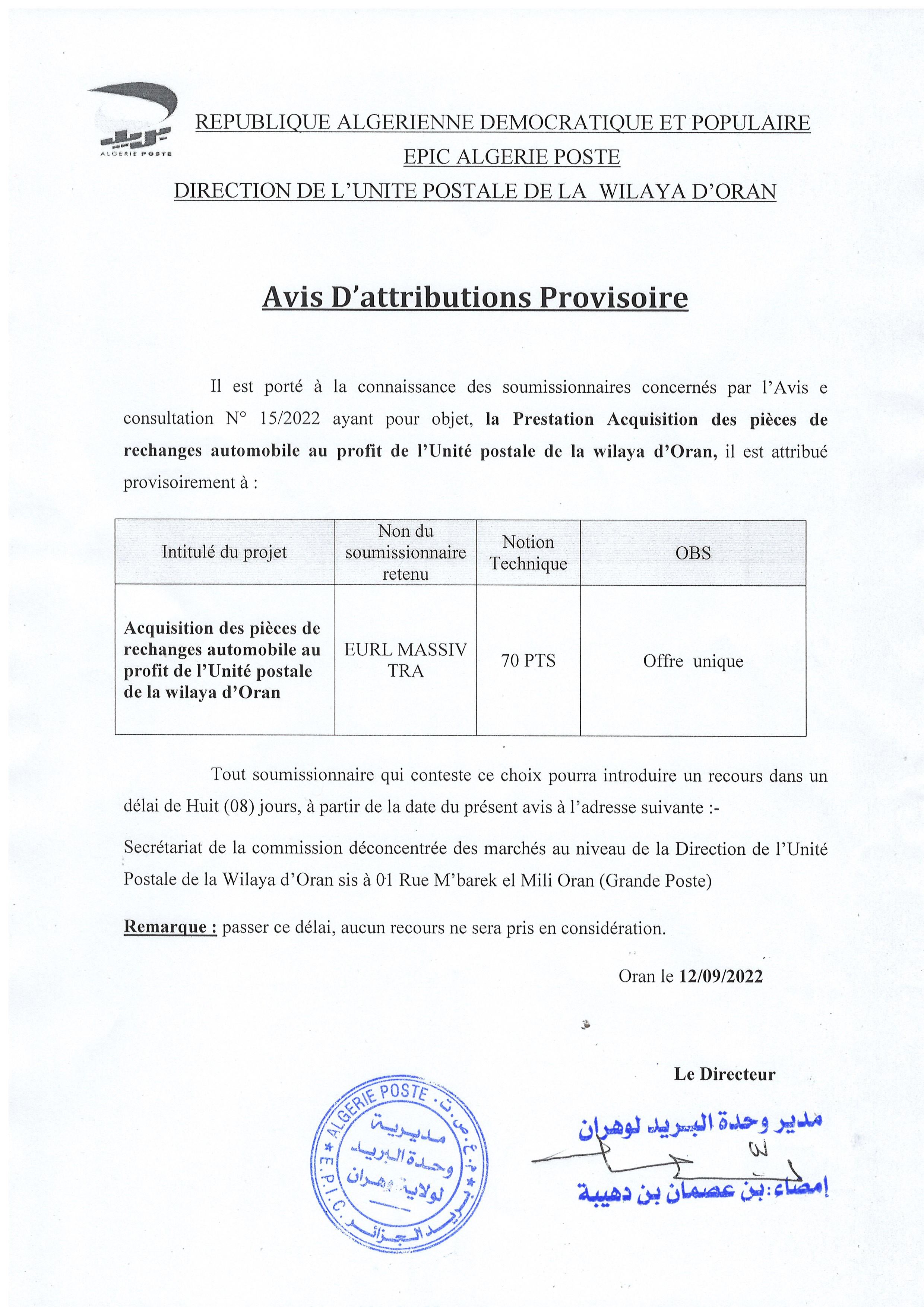 Objet : Acquisition des pièces de rechanges automobile au profit de l’Unité postale de la wilaya d’Oran.