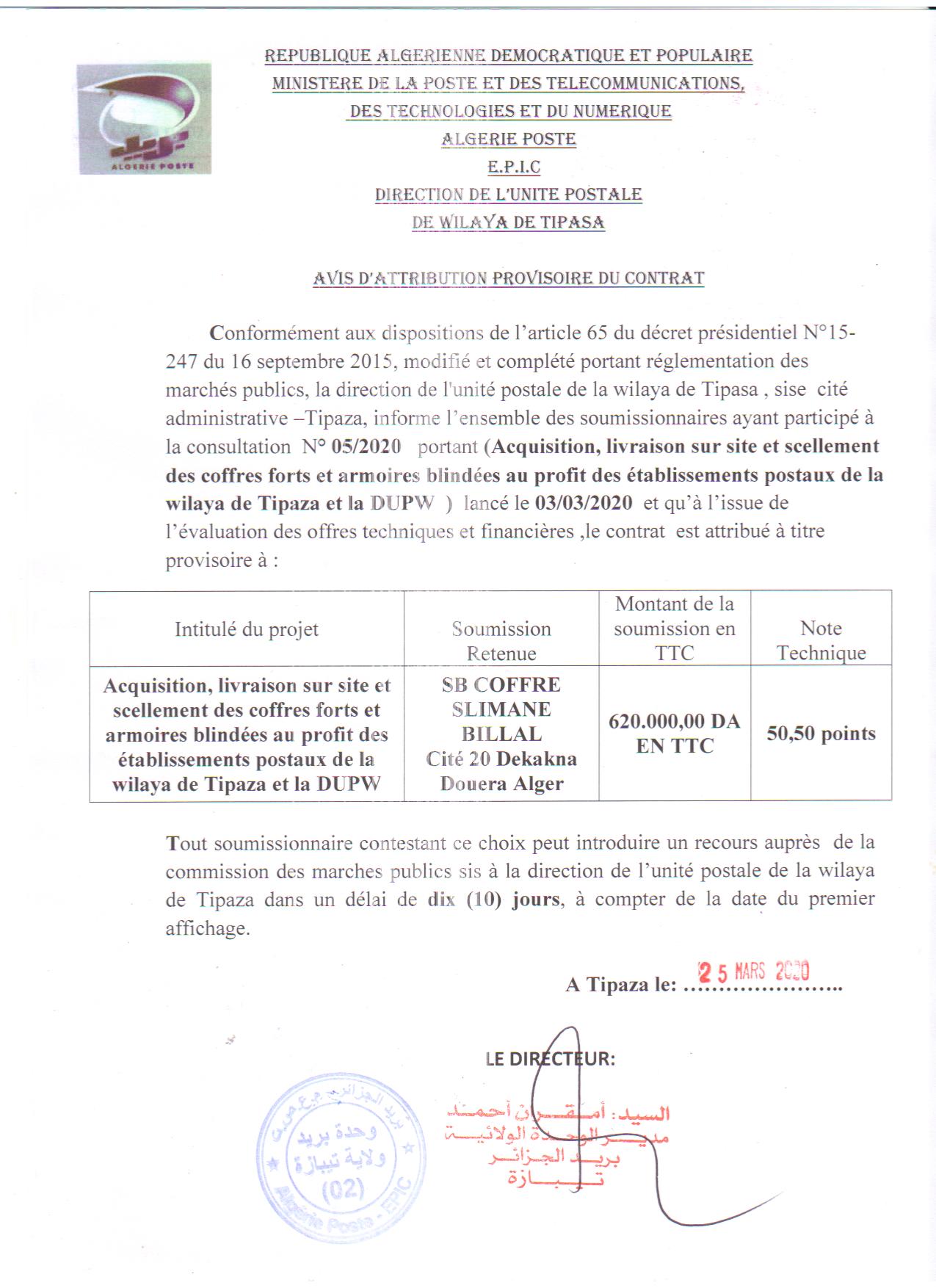 Objet : Acquisition, livraison sur site et scellement des coffres forts et armoires blindées au profit des établissements postaux de la wilaya de TIPAZA et la DUPW