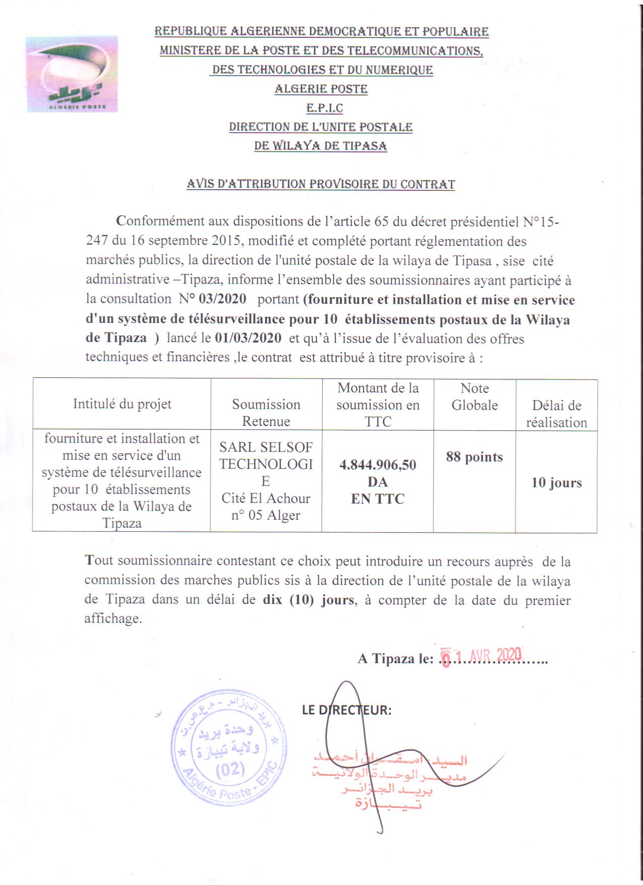 Objet : fourniture et installation rt mise en service d'un systéme de télésurveillance pour 10 établissements postaux de la wilaya de TIPAZA