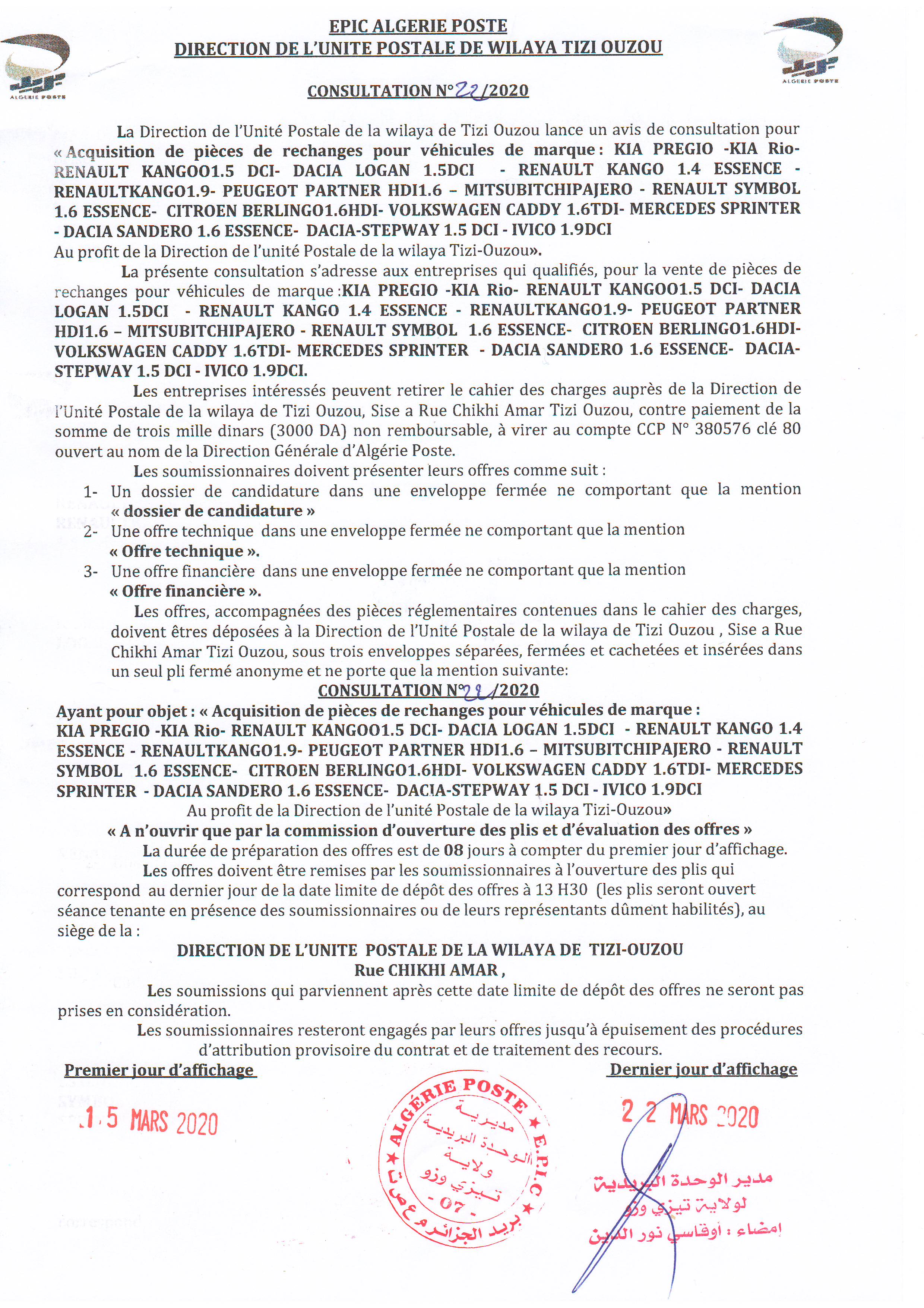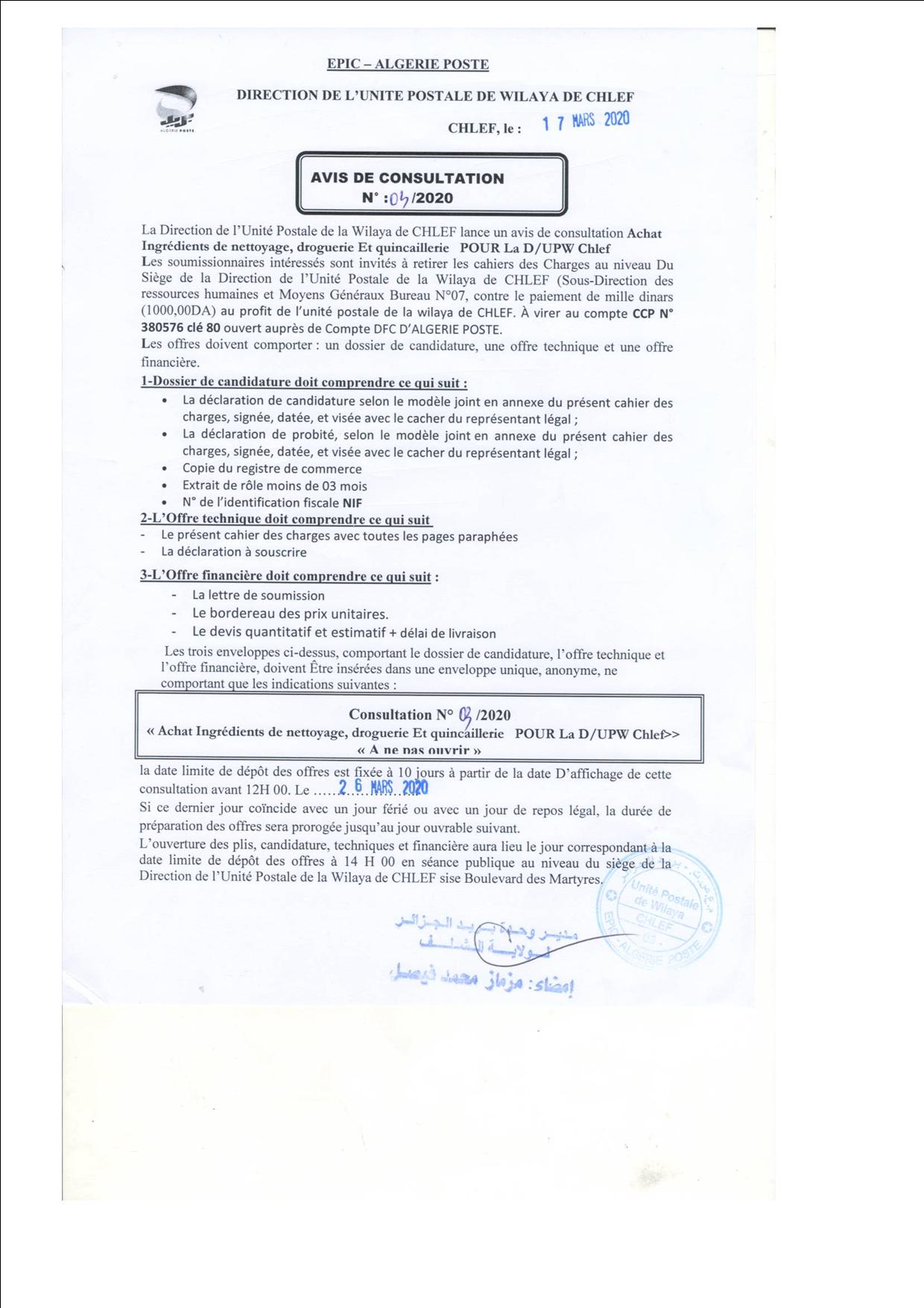 Objet : fourniture, installation et mise en service d'un systéme de télésurveillance pour les établissements postaux de Wilaya Ouargla