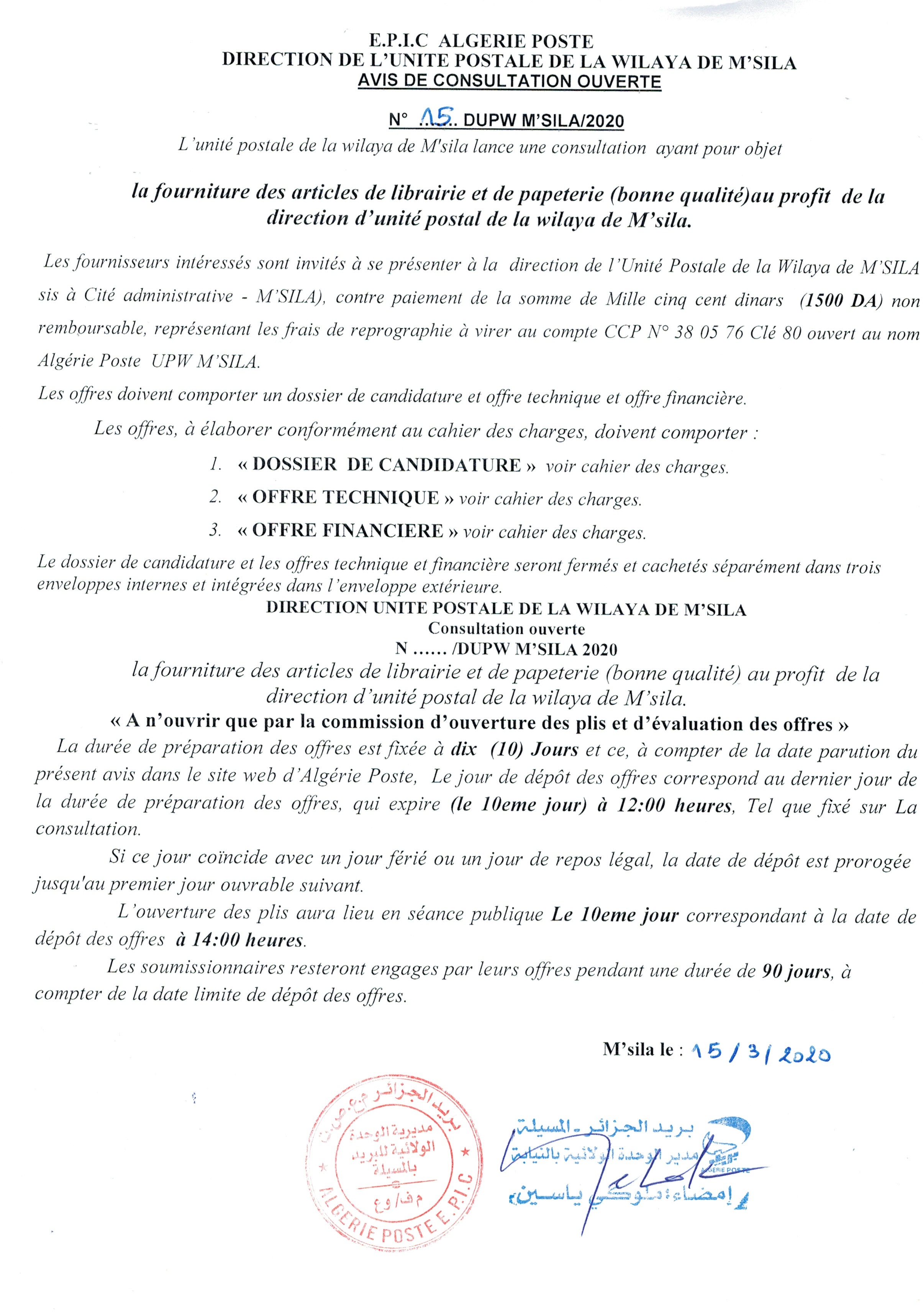 Objet : la fourniture des articles de librairie et de papeterie (bonne qualité) au profit de la Direction d'unité postal de la wilaya de M'SILA