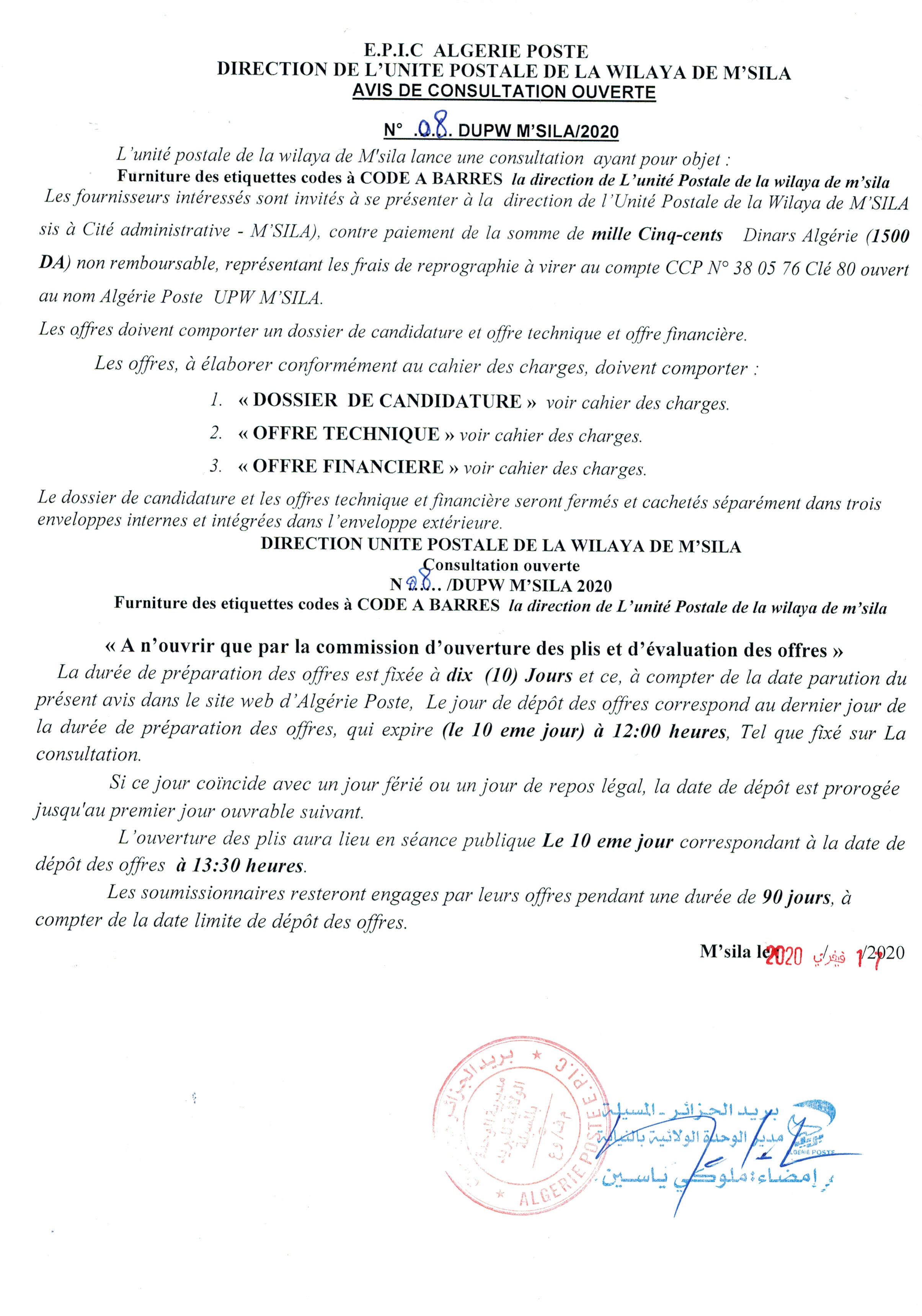 Objet : fourniture des étiquettes codes à code a barres la direction de l'Unité Postale de la Wilaya de M'sila