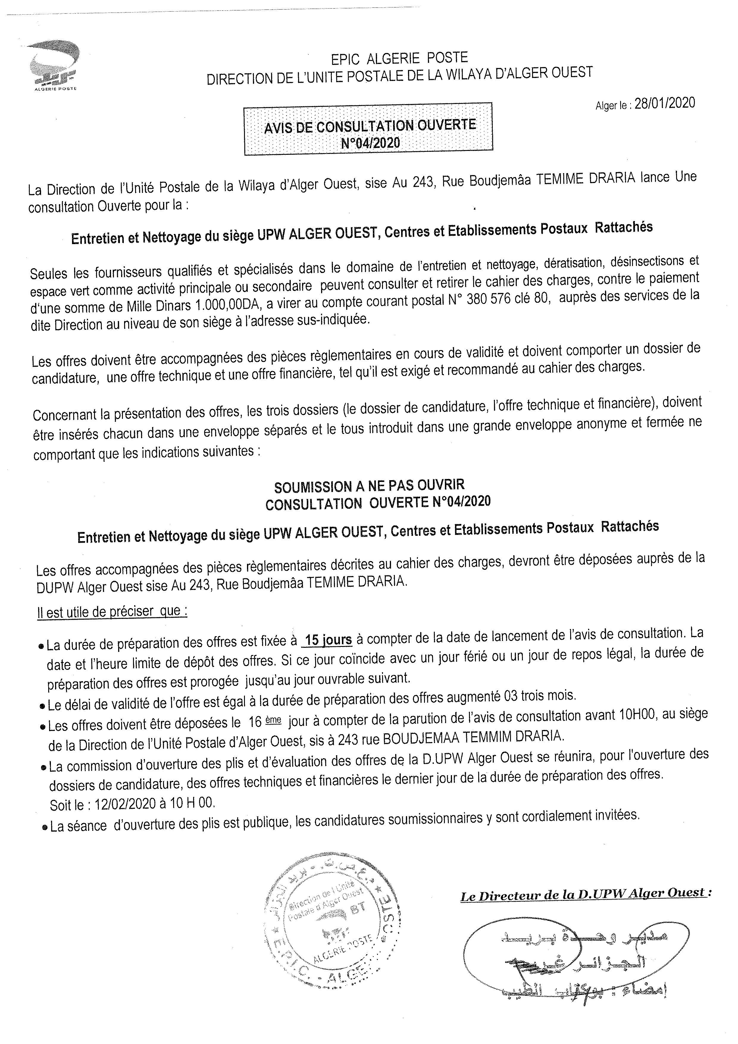 Objet : Entretien et nettoyage du siège UPW ALGER OUEST, Centres et établissements postaux rattachés