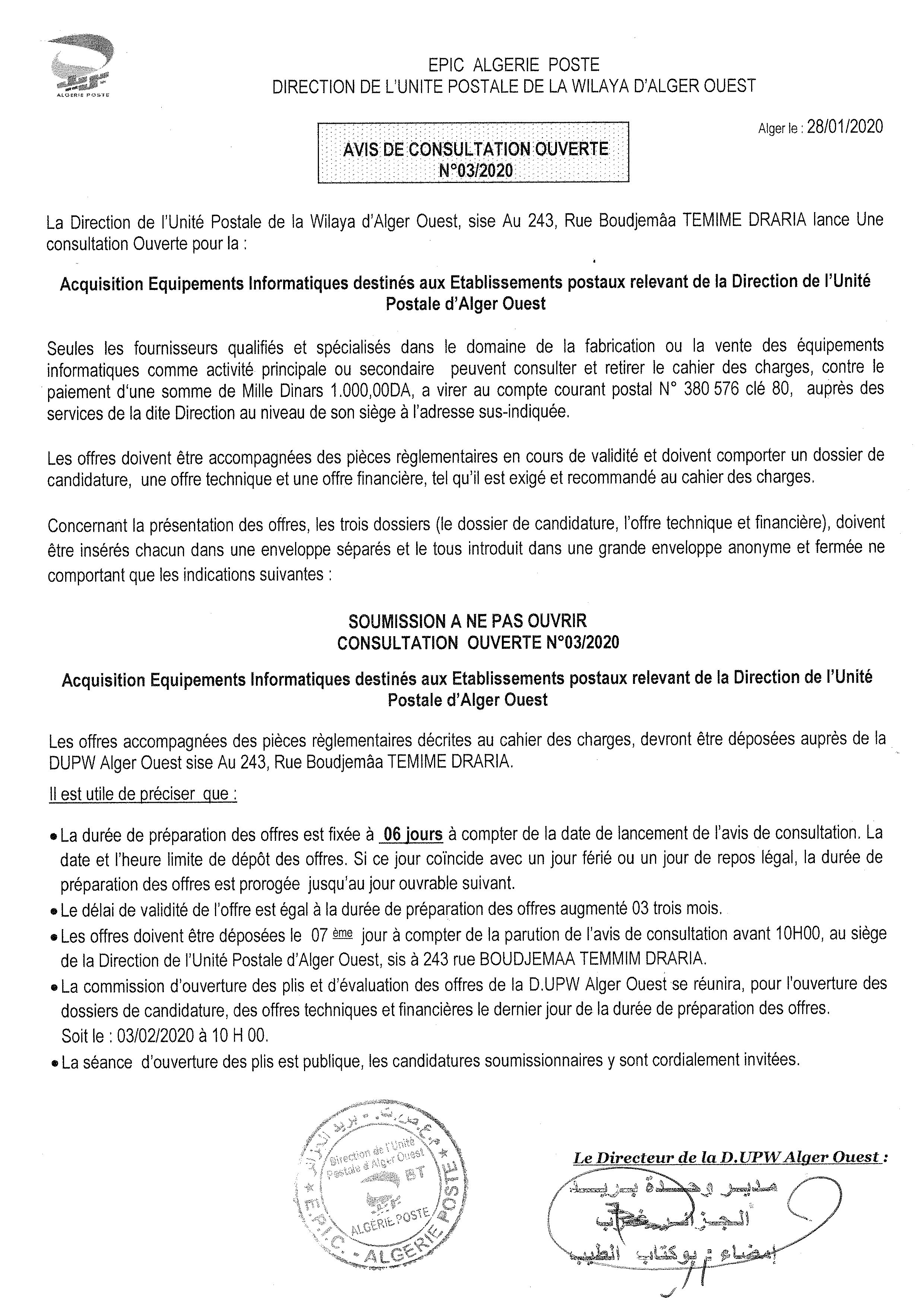 Objet : Acquisition équipements informatiques destinés aux établissements postaux relevant de la Direction de l'Unité Postale de la wilaya d'ALGER CENTRE.