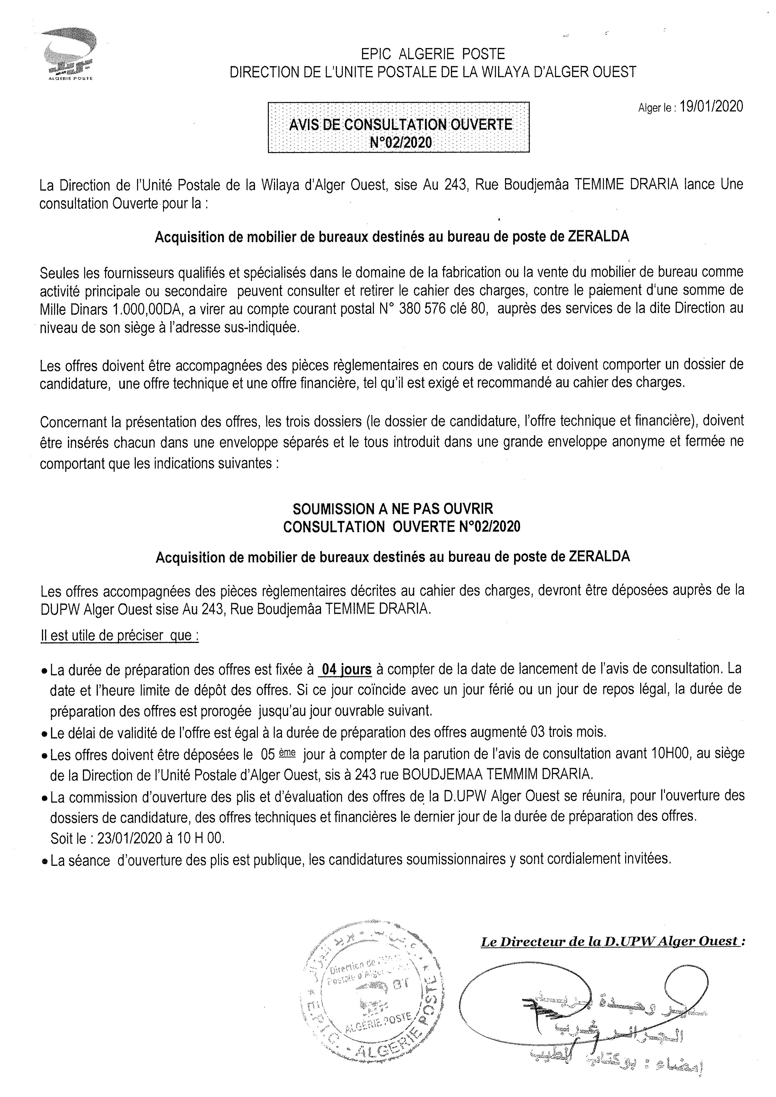 Objet : Acquisition de mobiliers au profit du bureau de poste EL MERIDJA.