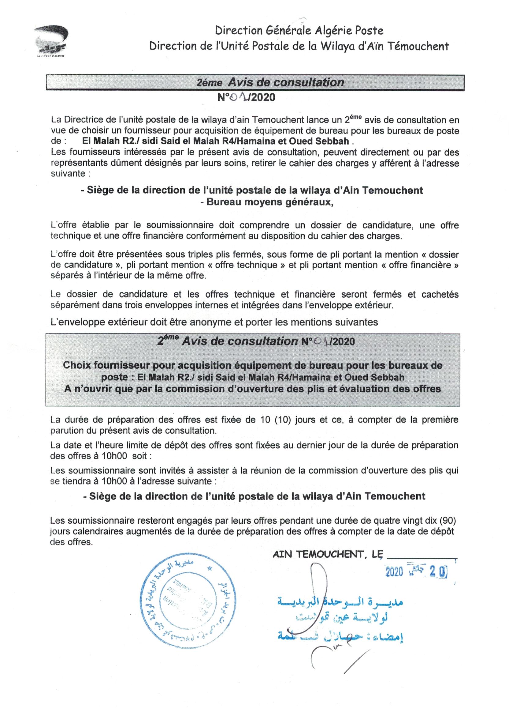 Objet : Acquisition equipement de bureau pour les bureaux de poste EL MALAH R2/SIDI SAID EL MALAH R4/HAMAINA ET OUED SEBBAH Wilaya de Ain Temouchent.