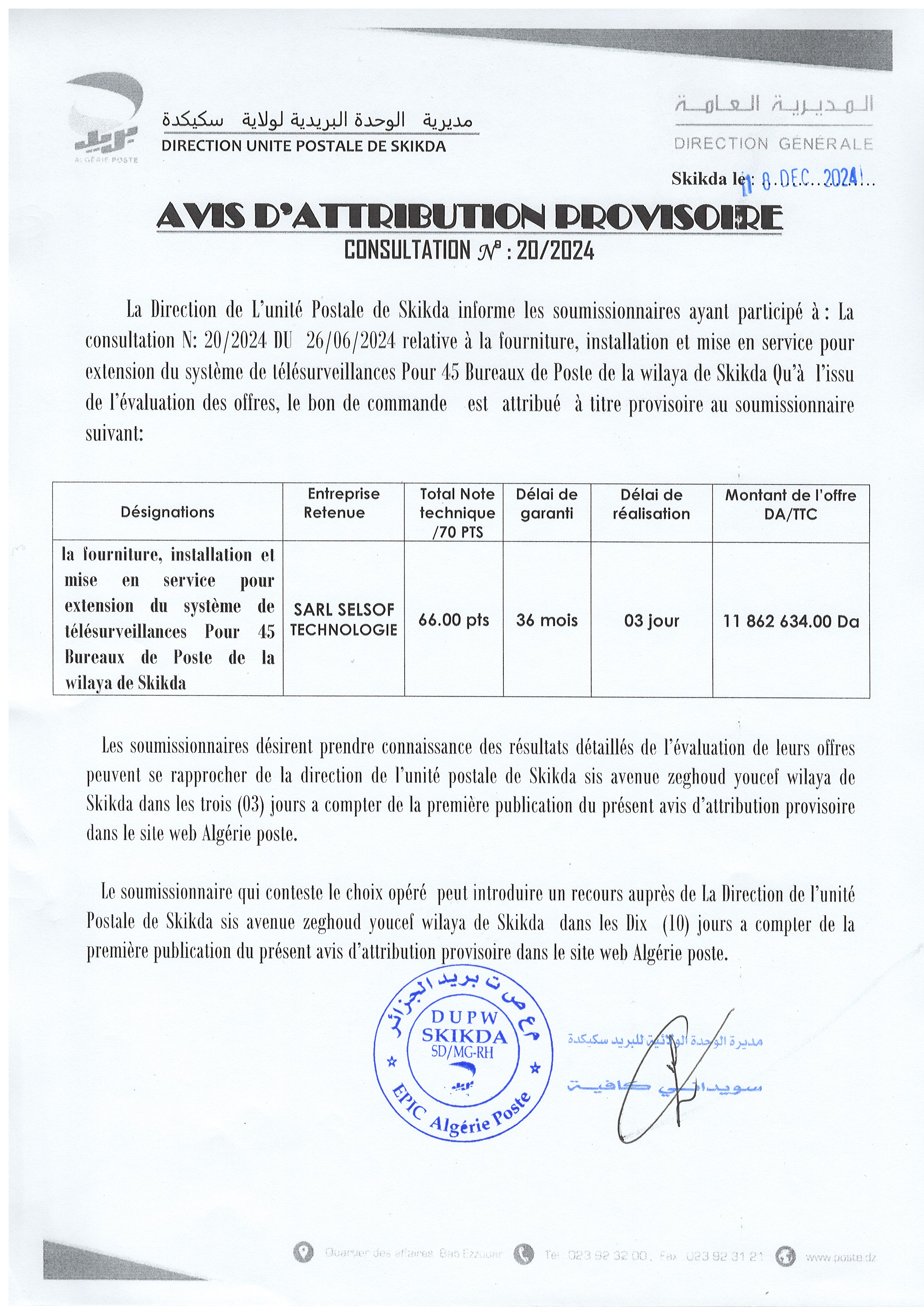 Objet : Fourniture, installation et mise en service pour extension du système de télésurveillances Pour 45 Bureaux de Poste de la wilaya de Skikda