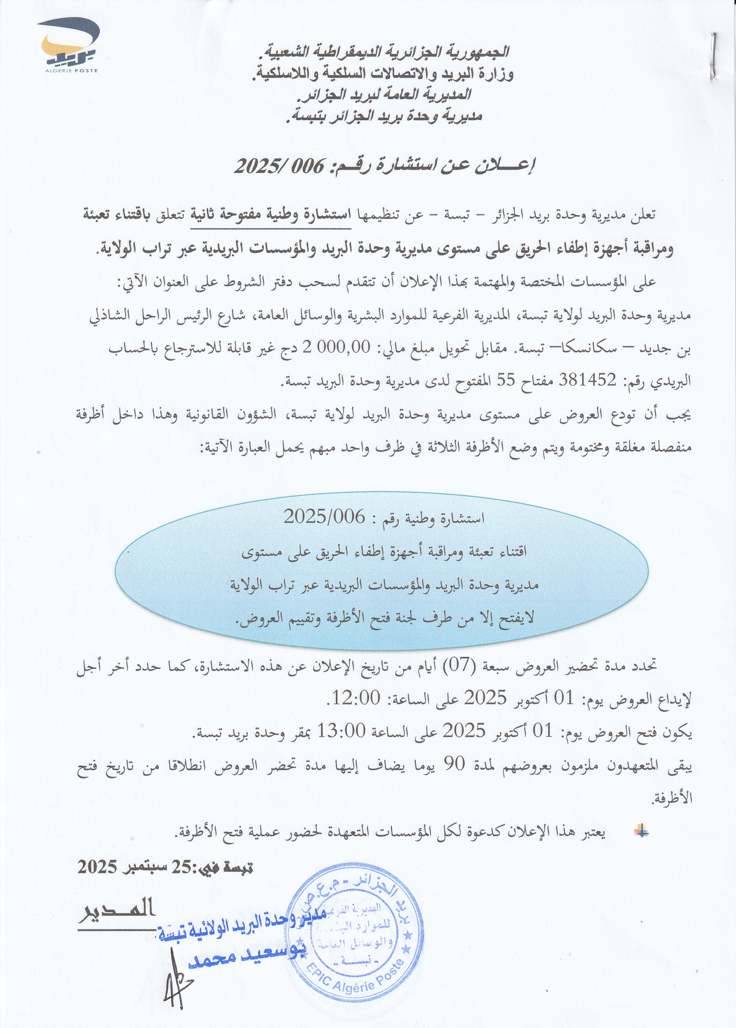 Objet : Acquisition des mobiliers et équipements informatiques au profit de l’établissement postal M’TOUSSA W.KHENCHELA