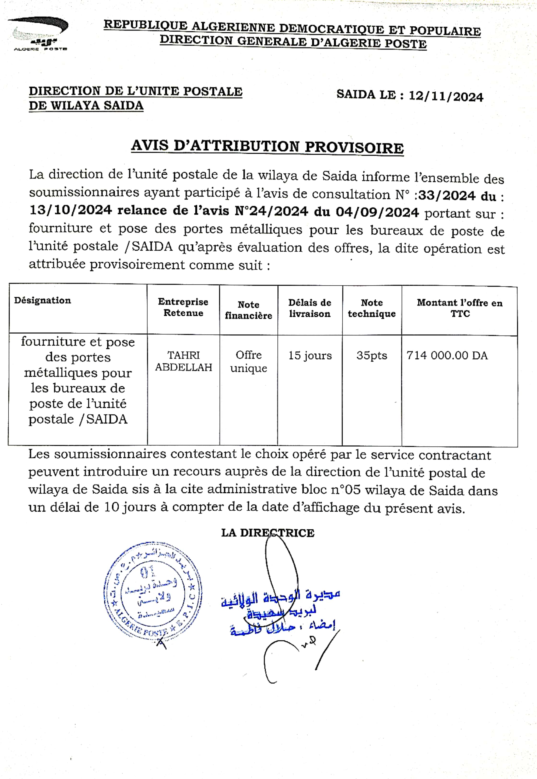 Objet : Fourniture et pose des PORTE METALLIQUE-SAIDA
