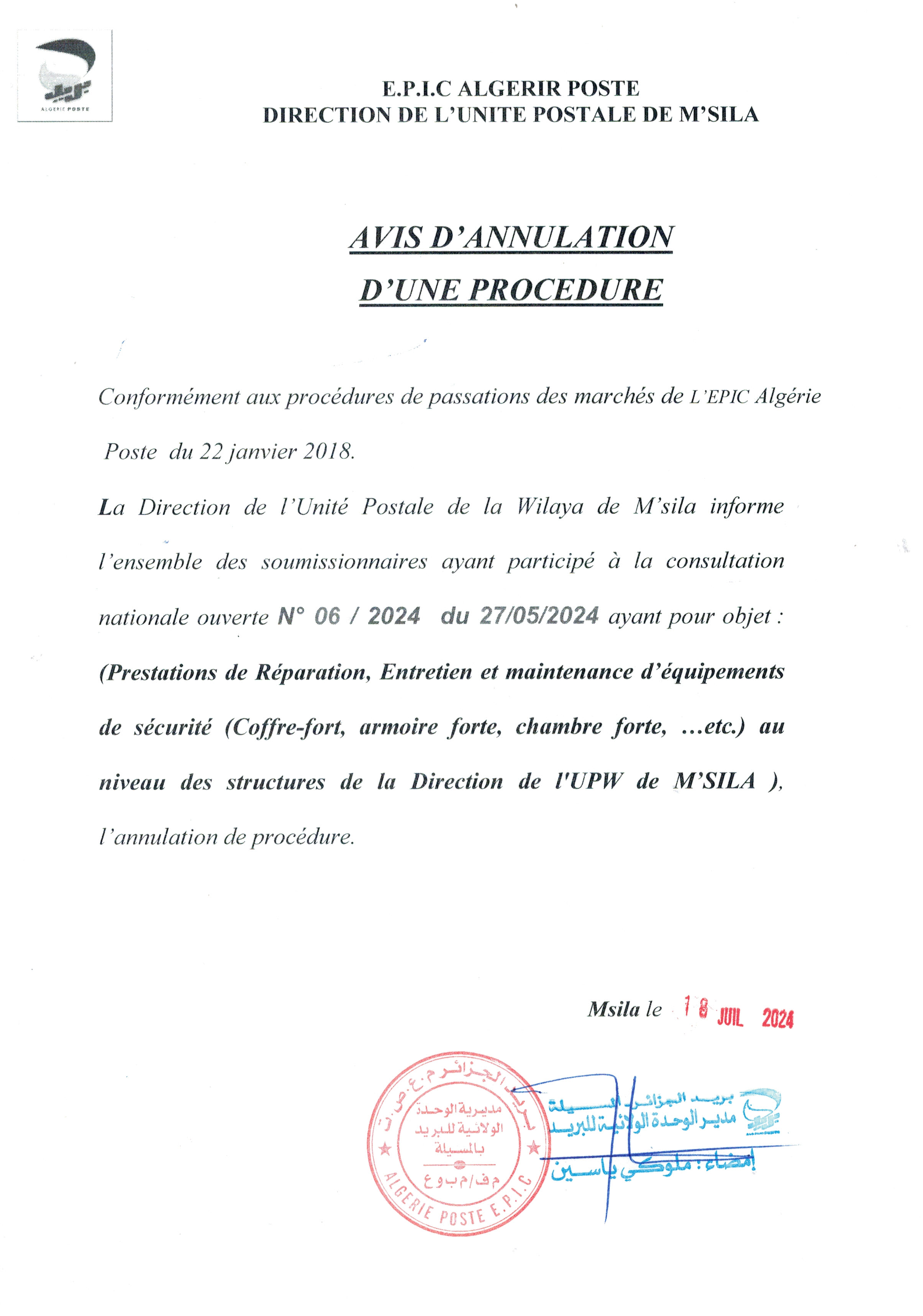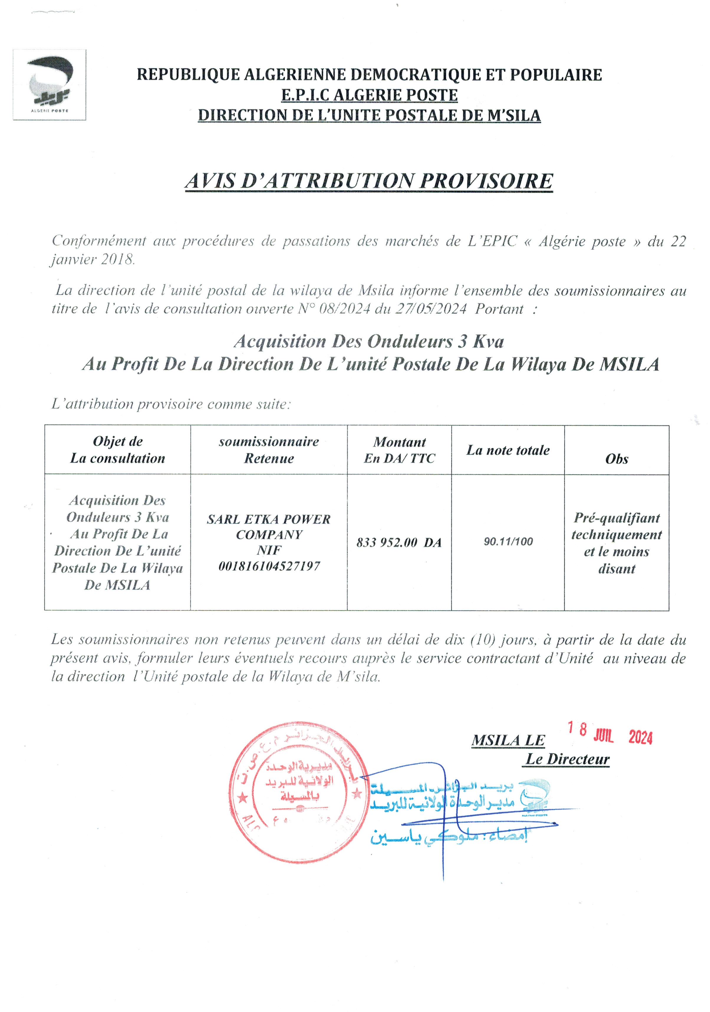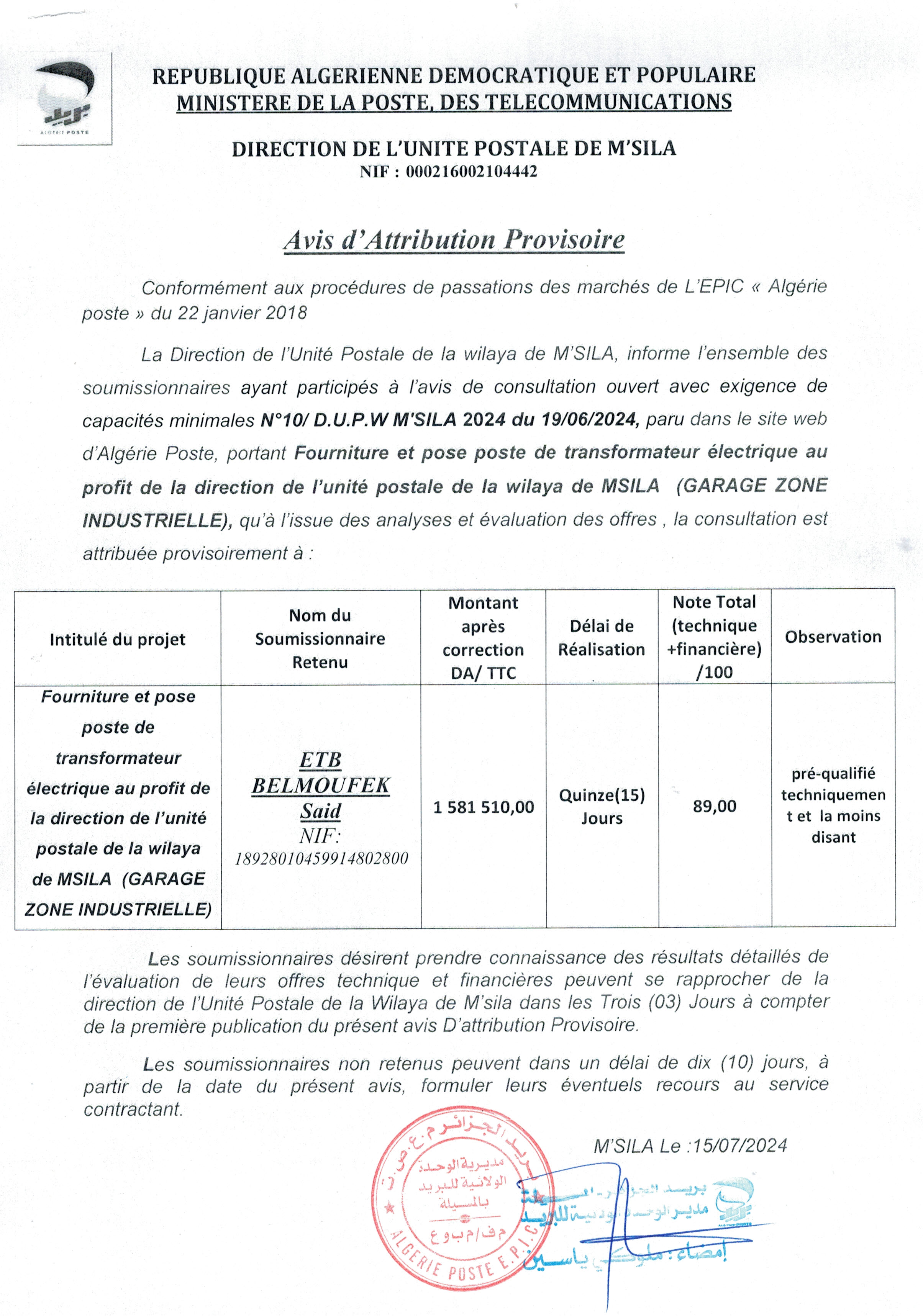 Objet : Fourniture, installation et mise en service d'un groupe électrogène de puissance 40 KVA à démarrage automatique, Au profit du bureau de poste Chechar (budget de L'état) de la direction de l'unité postale de khenchela