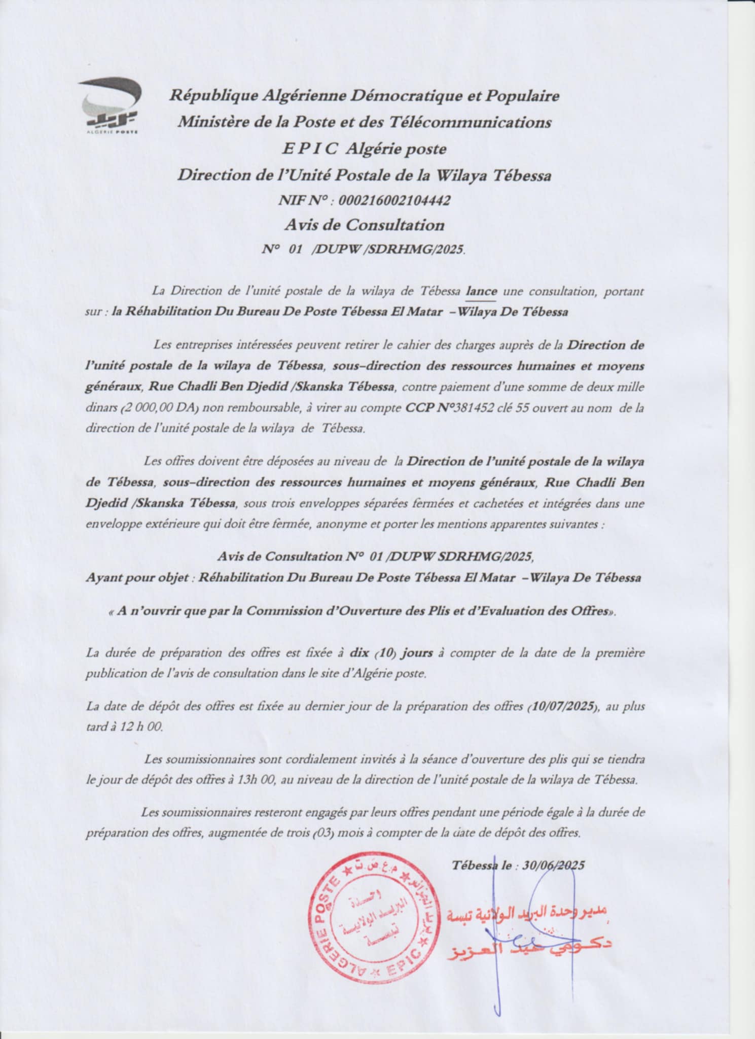 Objet : Réhabilitation du bureau de poste Tébessa El Matar - wilaya de Tébessa.