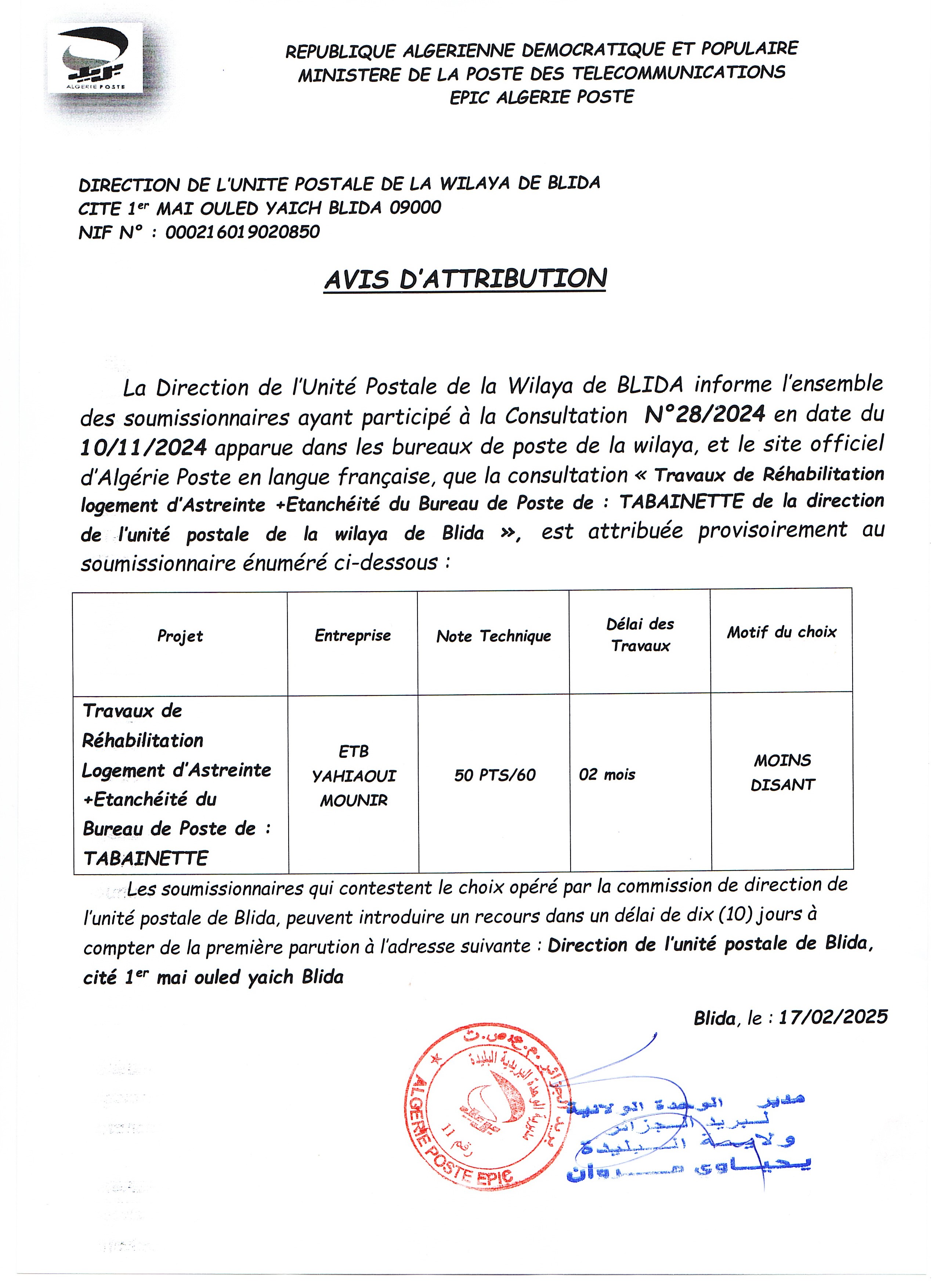 Objet : Travaux de réhabilitation logement d'astreinte (étanchéité bureau de poste TABAINETTE) DUPW BLIDA
