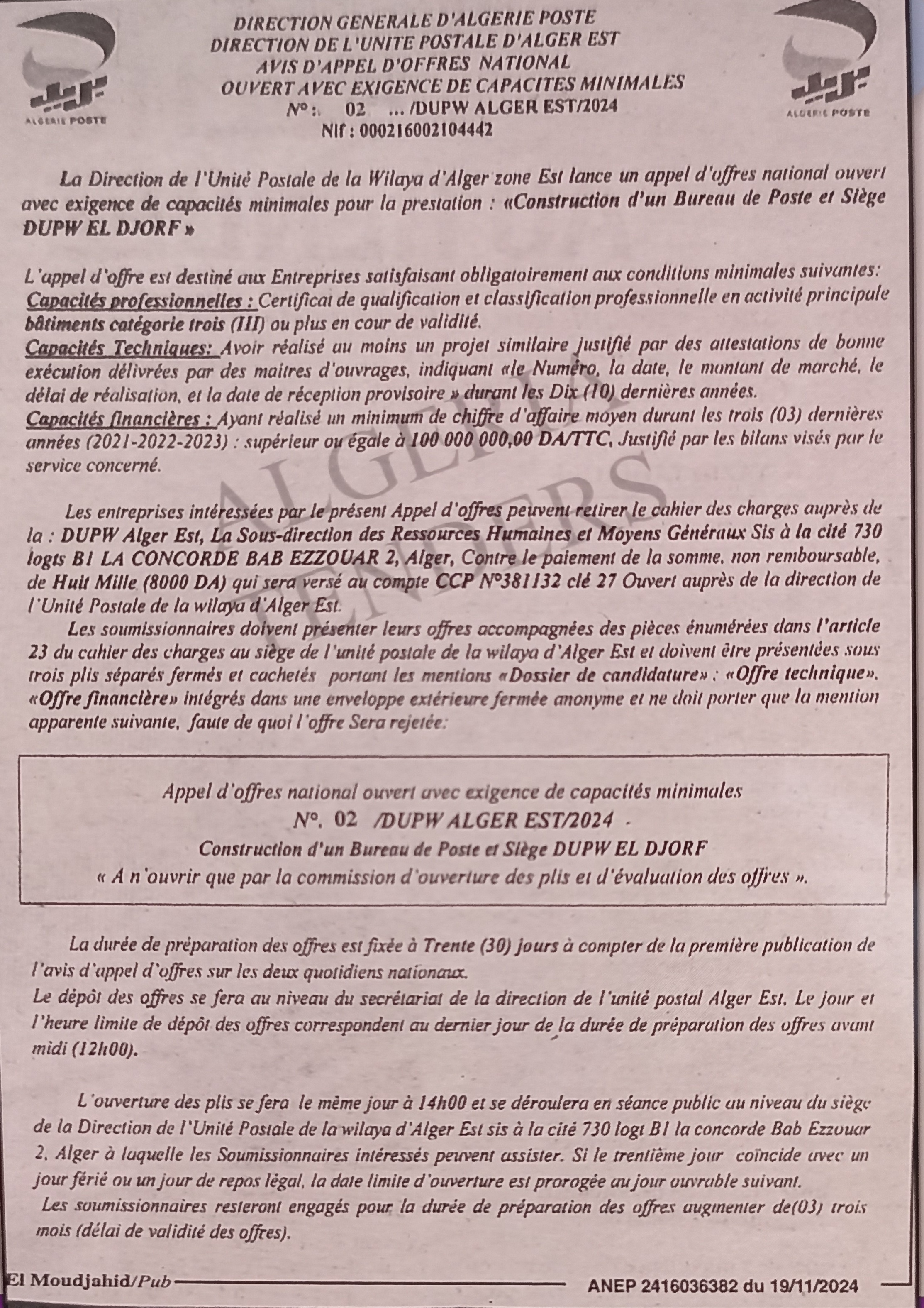 Objet : Construction d'un bp et siège el djorf ALGER EST