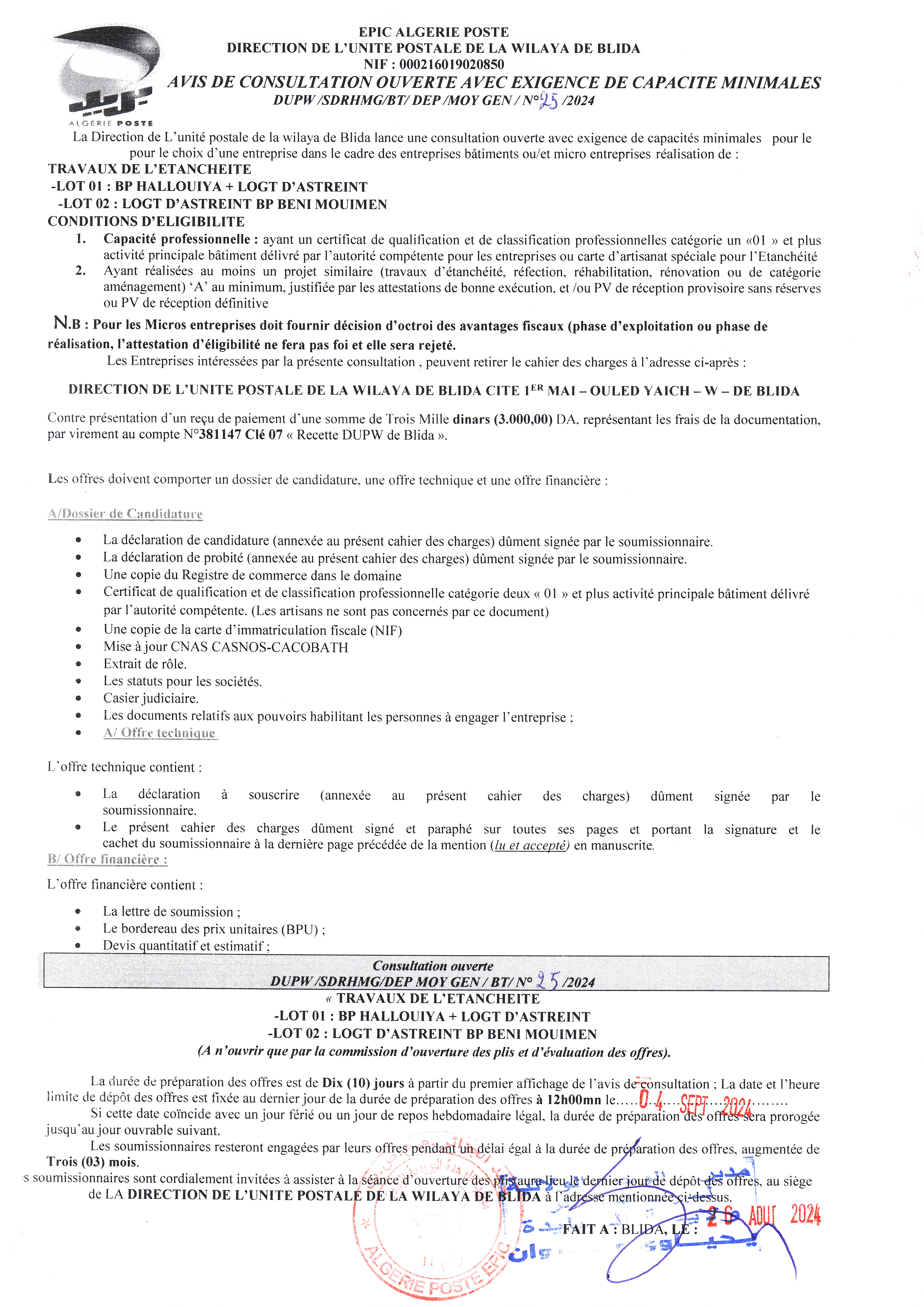 Objet : Travaux d'étanchéité en 02 lots BLIDA