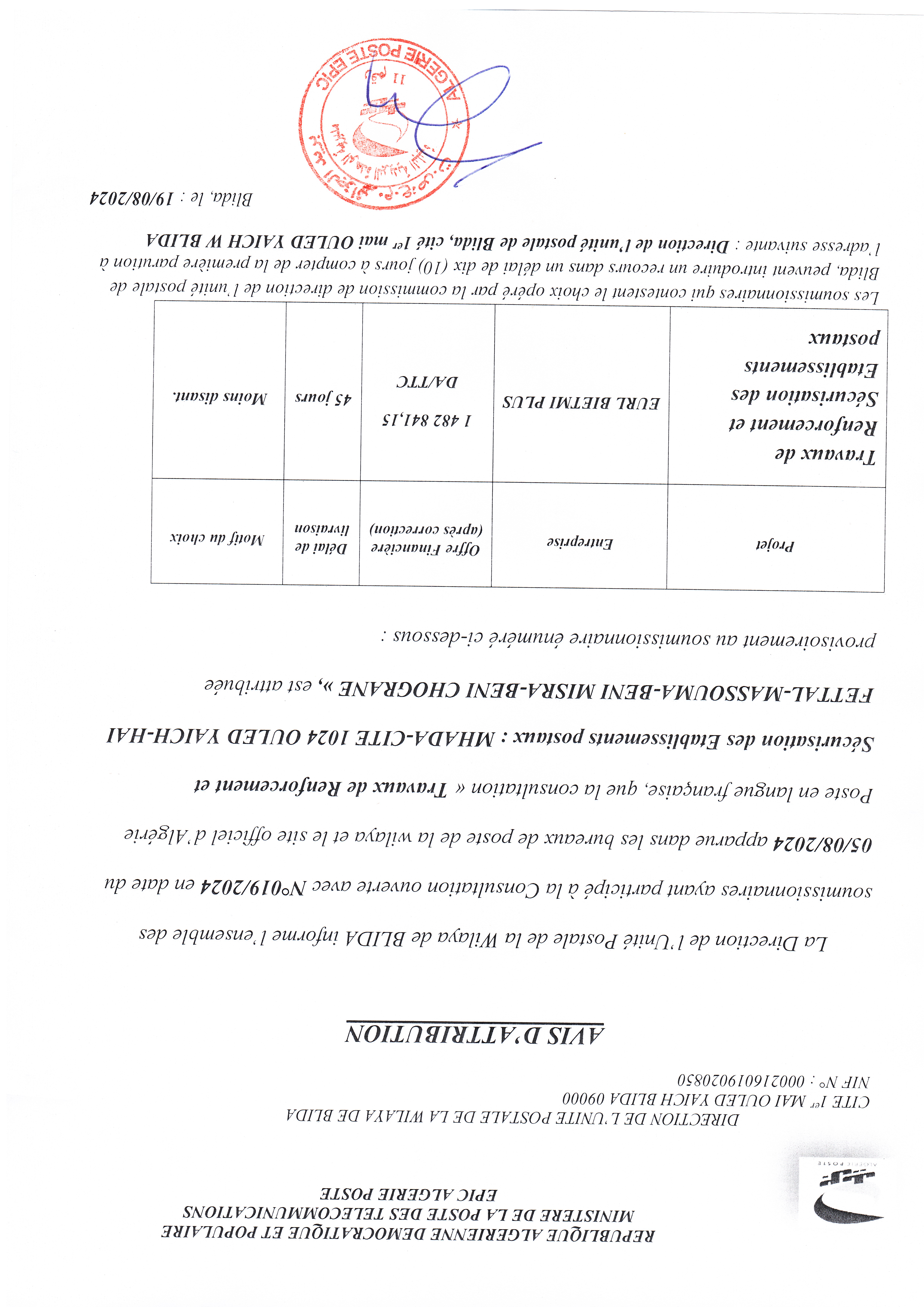 Objet : TRAVAUX RESTE À RÉALISER relatifs aux TRAVAUX DE REHABILITATION ET EXTENSION DES DEUX BUREAUX DE POSTE AU PROFIT DE LA DIRECTION DE L’UNITE POSTALE DE LA WILAYA DE MOSTAGANEM. LOT N°02 : Bureau de Poste Ain Nouissy + logement